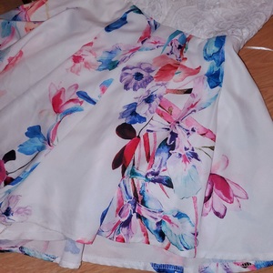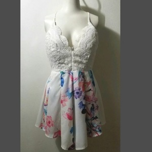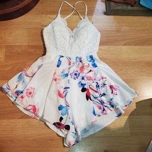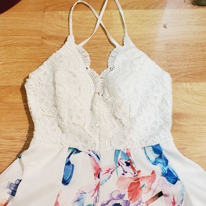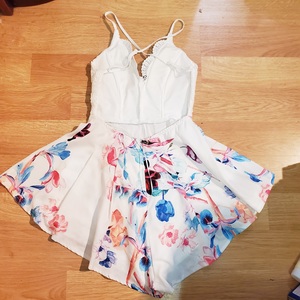 This is brand new with tags romper from Shareen collection Australia in a size 10, which is a US size 6. But fit between a small a medium. The skirt is lined, there are fully adjustable criss cross straps, boning on the upper half, padding for support and an open back.