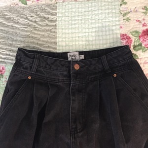 Black denim jeans, sturdy fabric, high-waisted with a pleating-like design. Bought for $65 from Princess Polly. Marked size 6 but could fit up to 10 as it is a bit oversized.