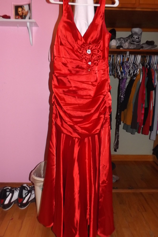 Only worn this 1 time to prom. the size is extra large but fits like a large. there is like little strings around the diamond things on the flowers but other than that its in excellent condition!