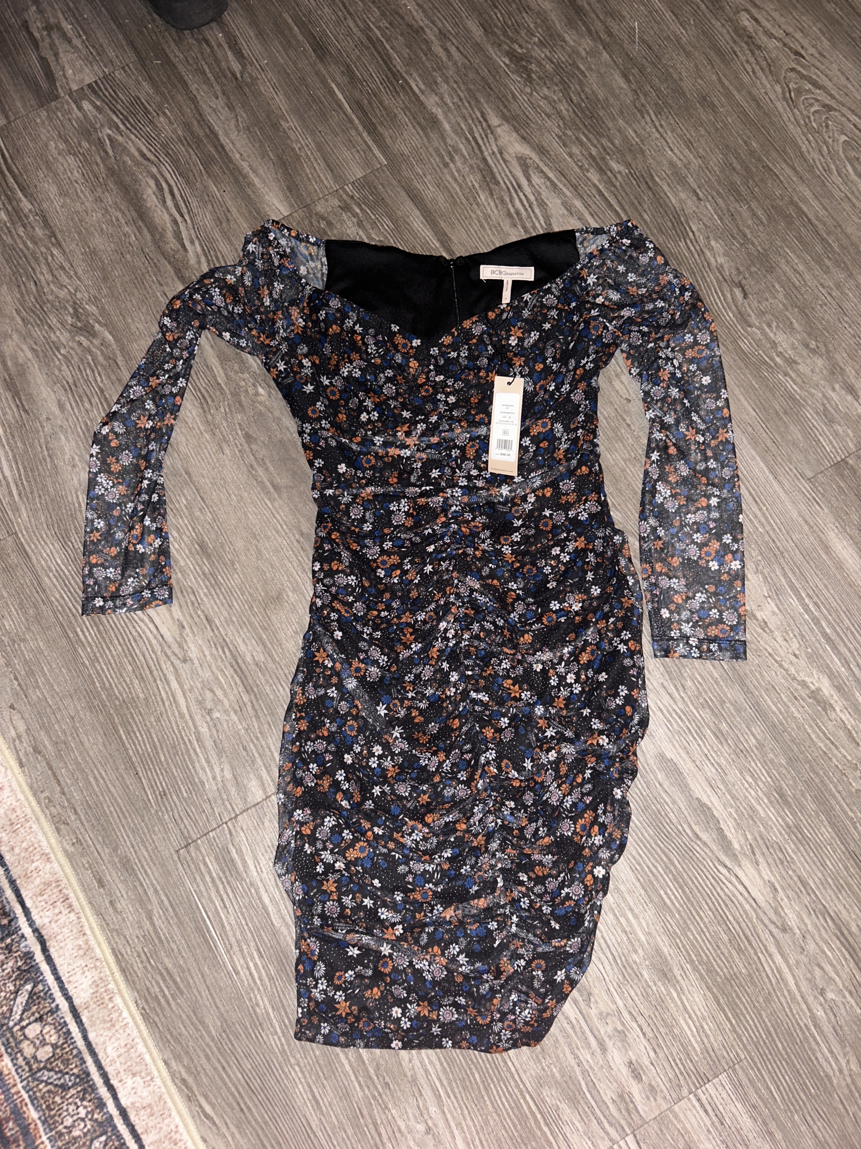 Size 6, BCBGeneration floral long sleeve dress. Sheer sleeves. Dark blue, orange and white.