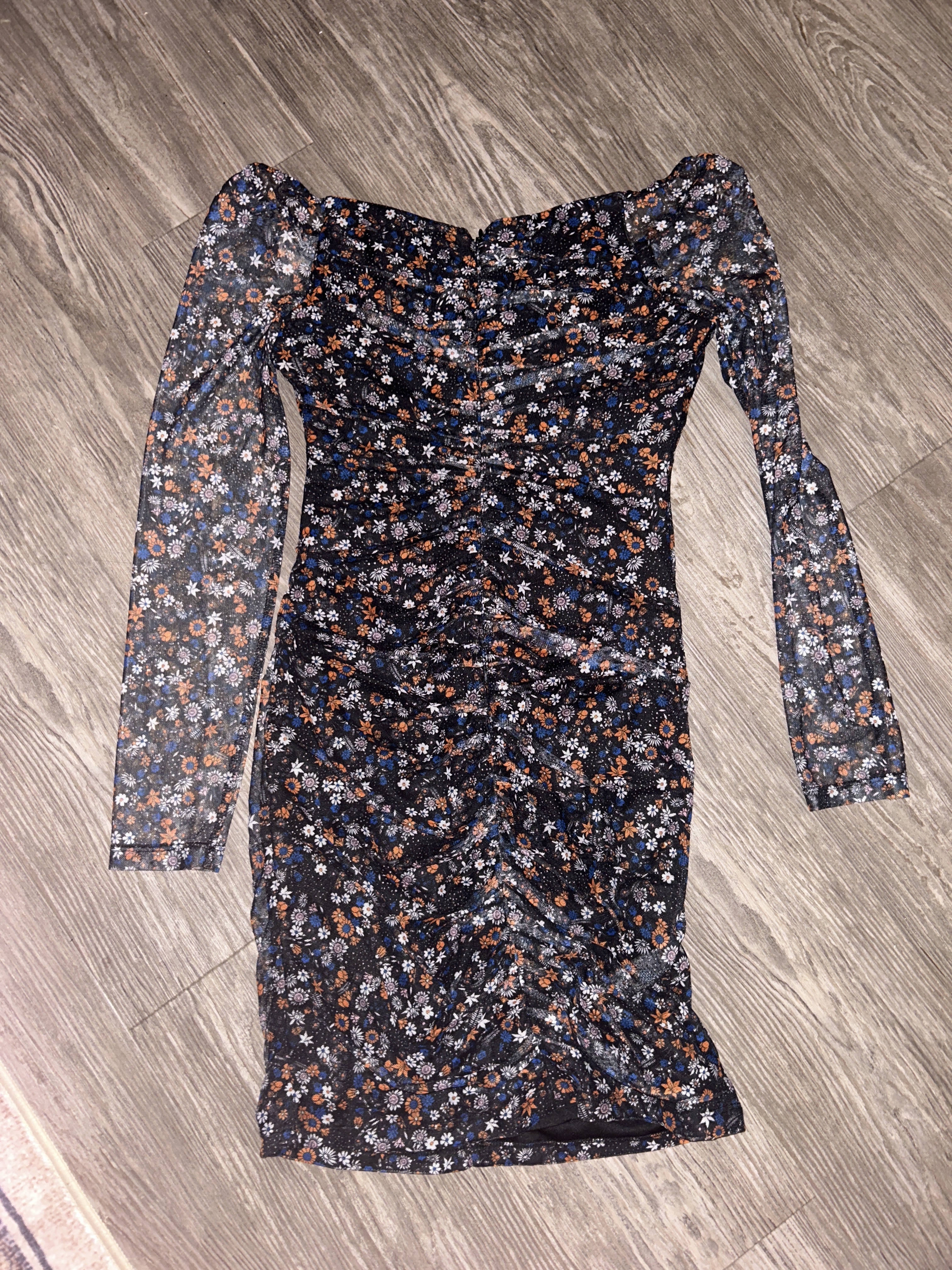 Long sleeve floral dress with sheer sleeves.