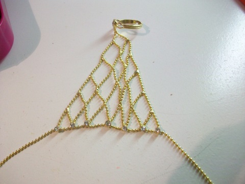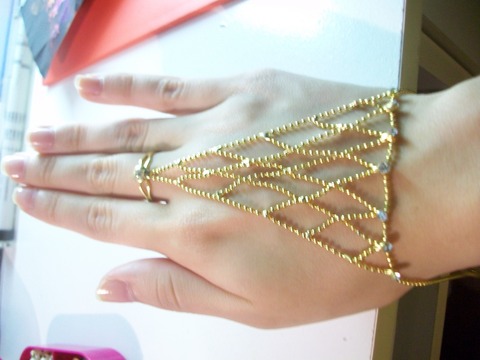 Gold tone bracelet. Starts with a ring and extends towards the wrist. Definitely something interesting and new. Very exotic looking.
