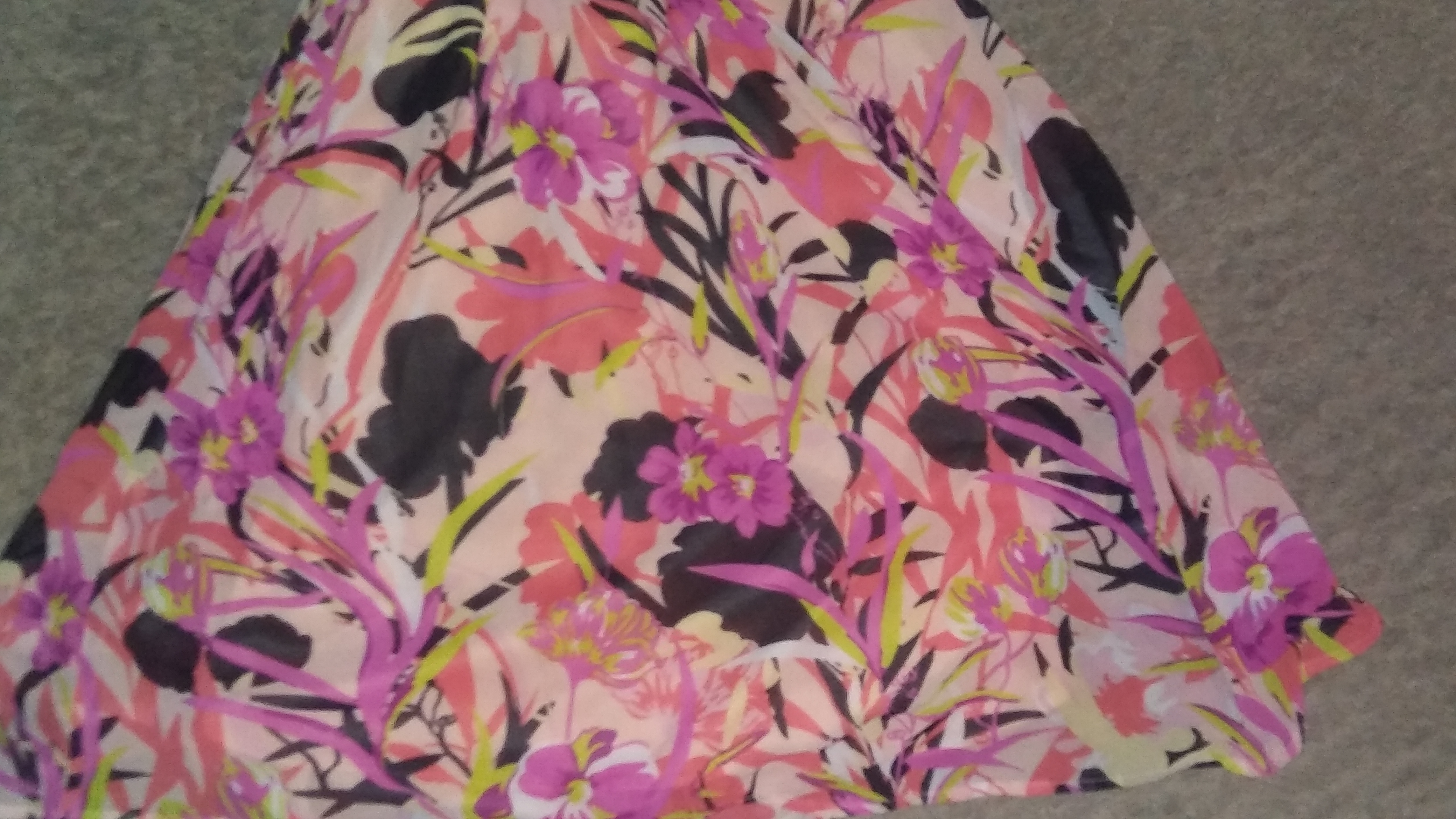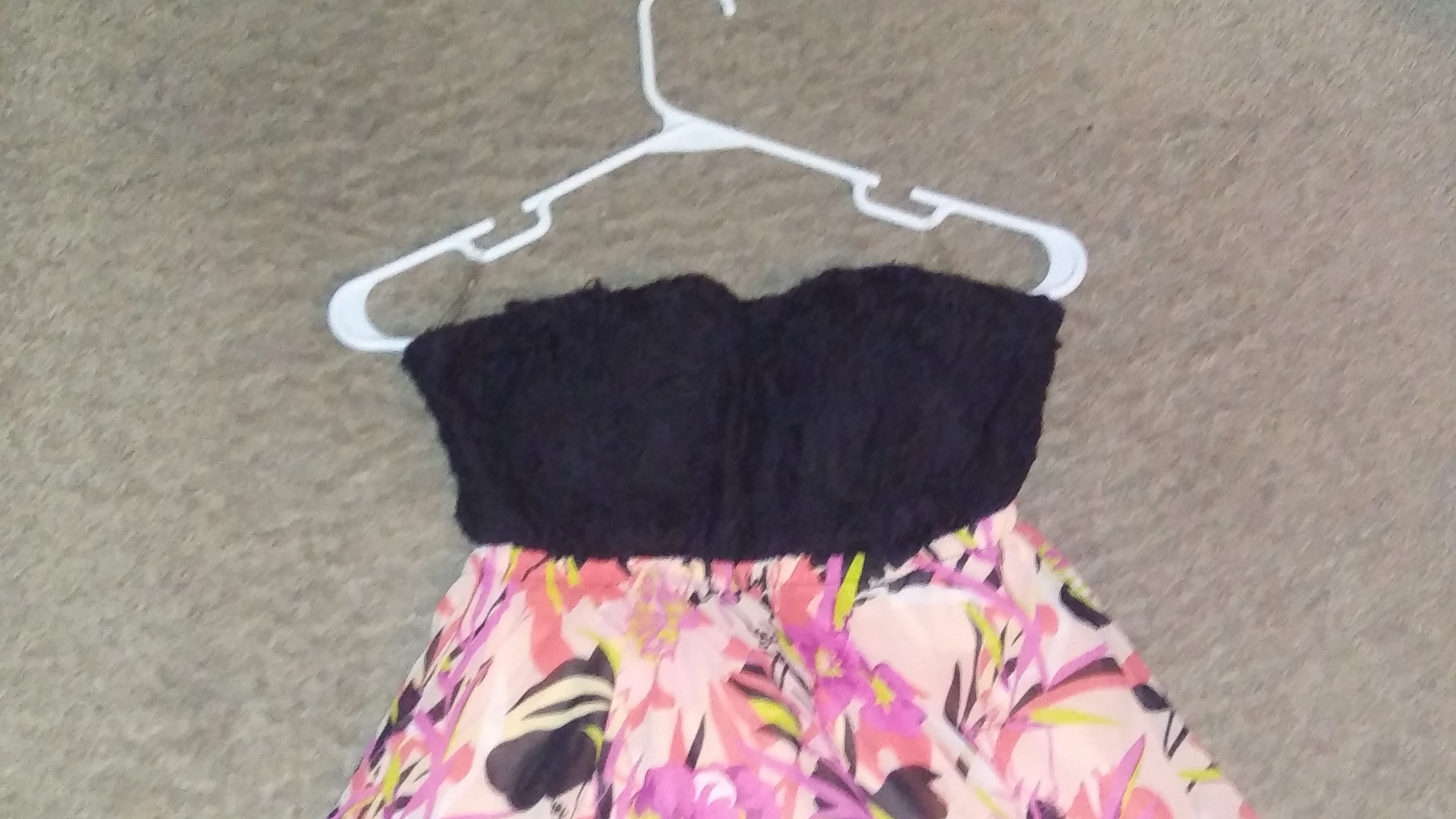 Sleeveless black and pink floral dress. Excellent condition. This dress is a Large in women's wear. A black top, with pink, yellow, and orange designs on the bottom half.