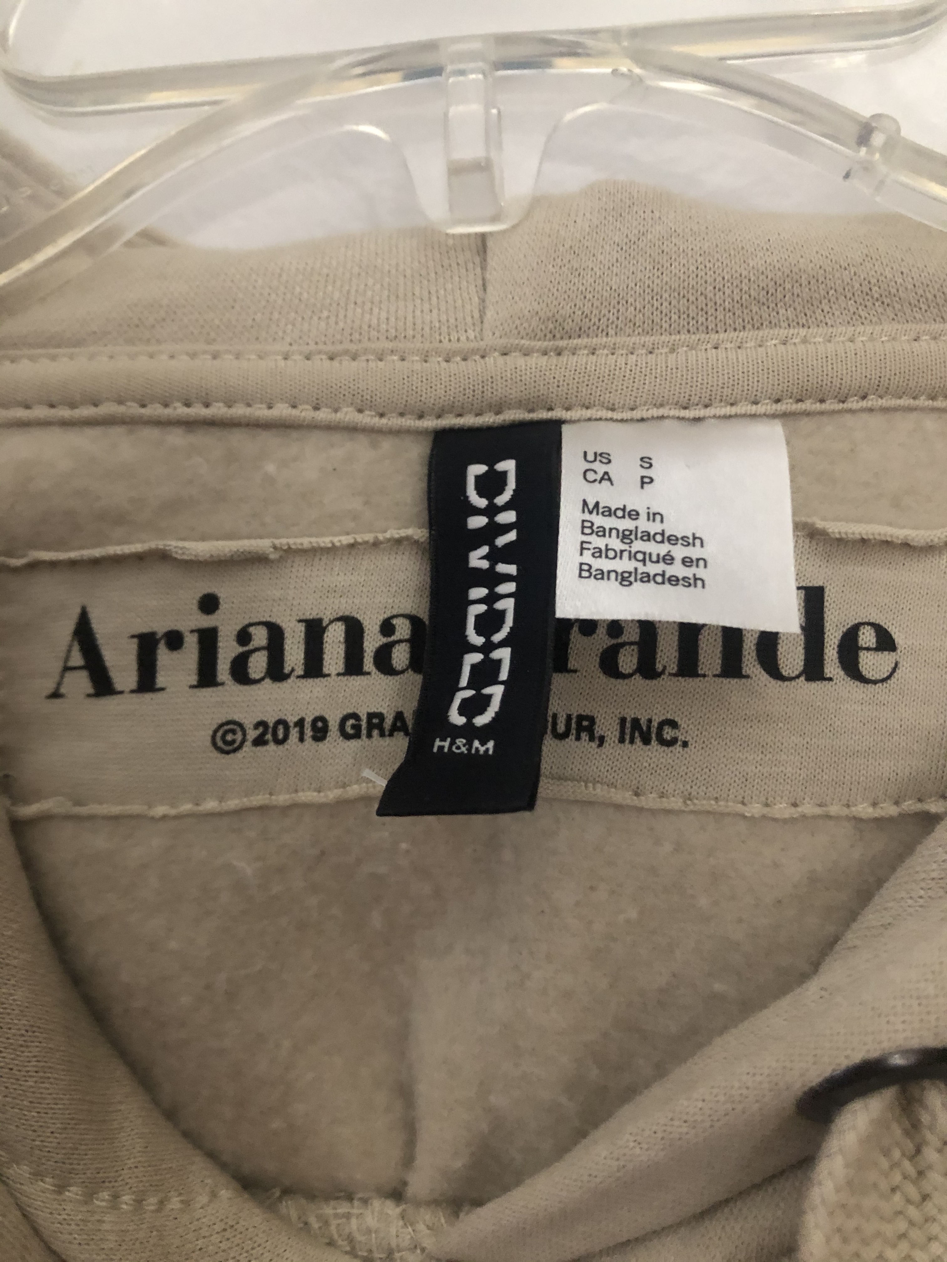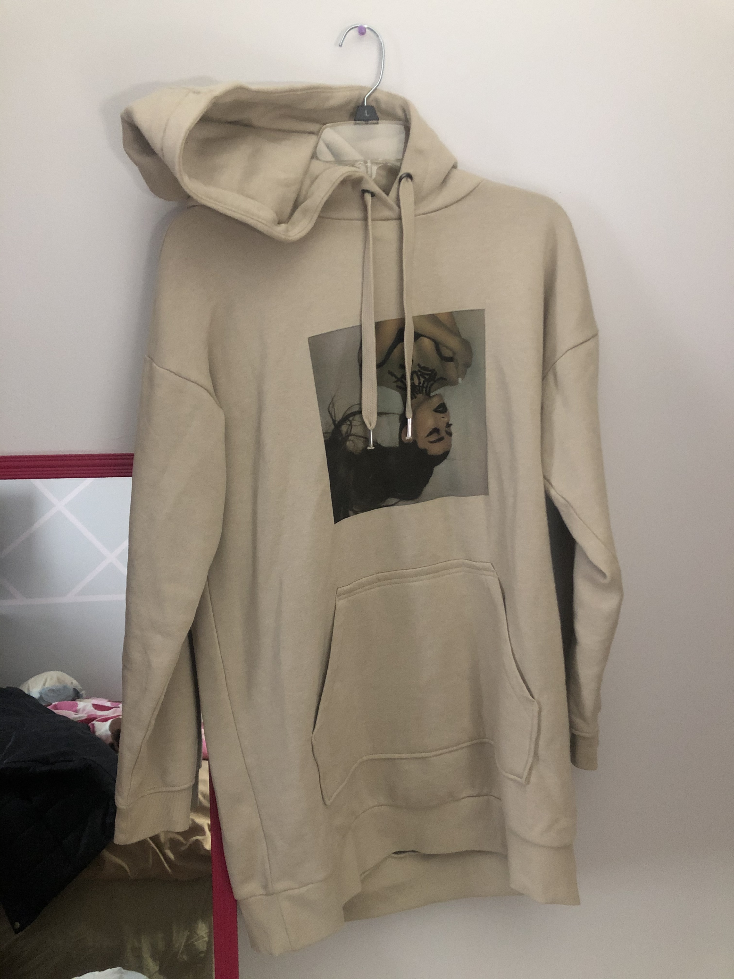 Ariana Grande Sweatshirt Dress size small. However, it also fits size medium since is oversized. I’m 5’ 2” and it goes right above my knees. Very soft on the inside!