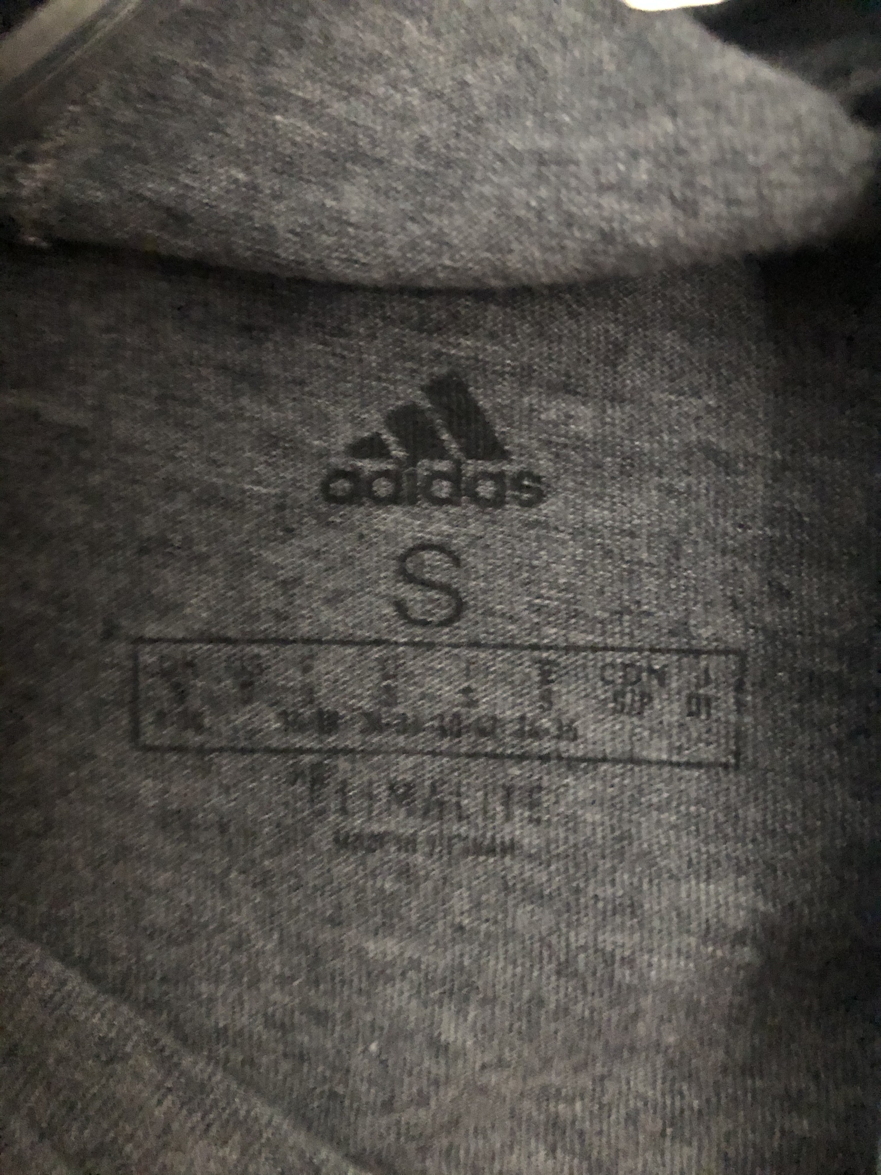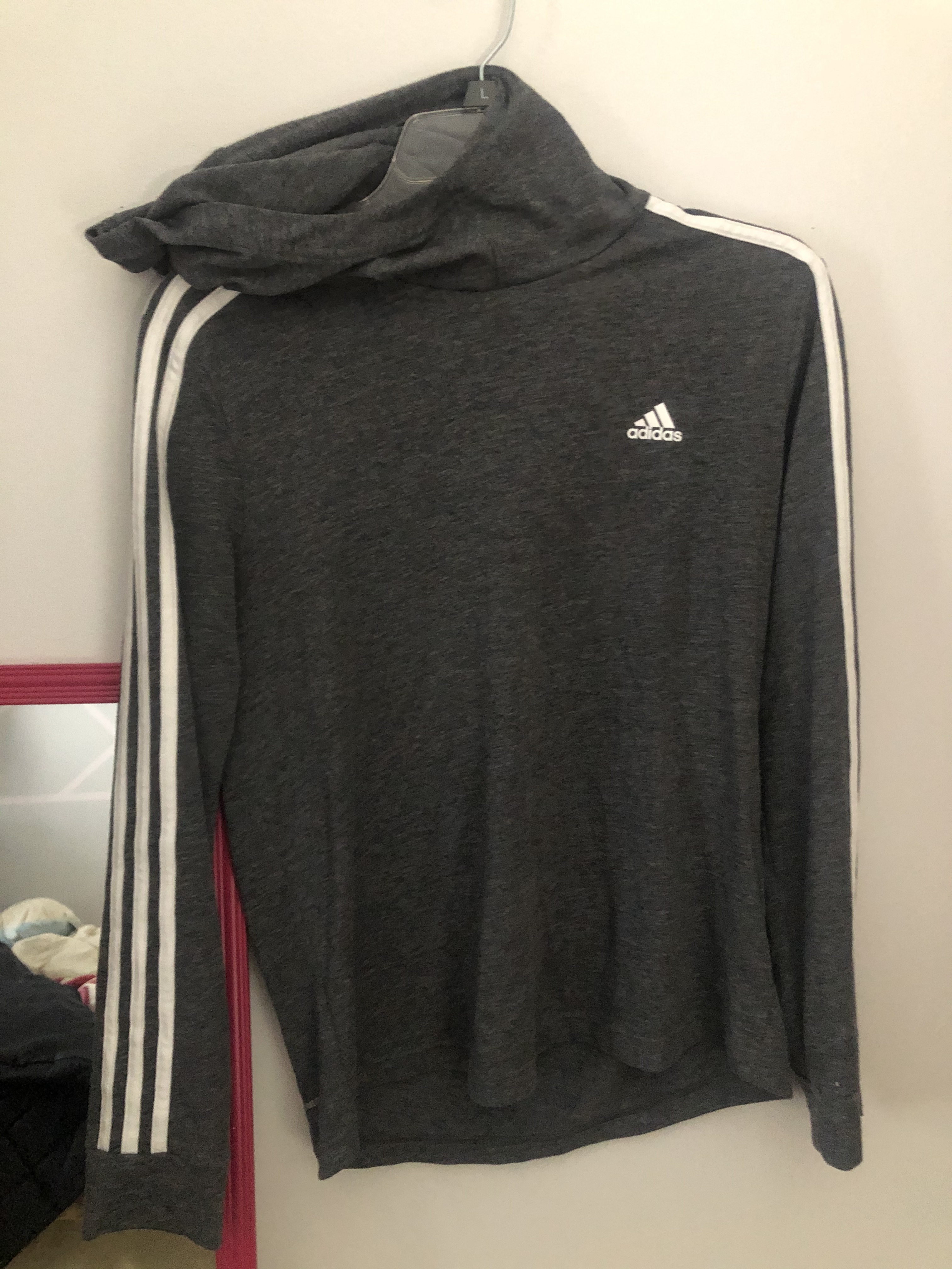 Adidas hooded long sleeve size small, but could also fit size medium. It’s got white stripes going doing the sleeves and is very comfortable. It’s not a jacket though, it’s thin like a regular shirt.
