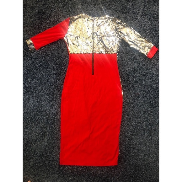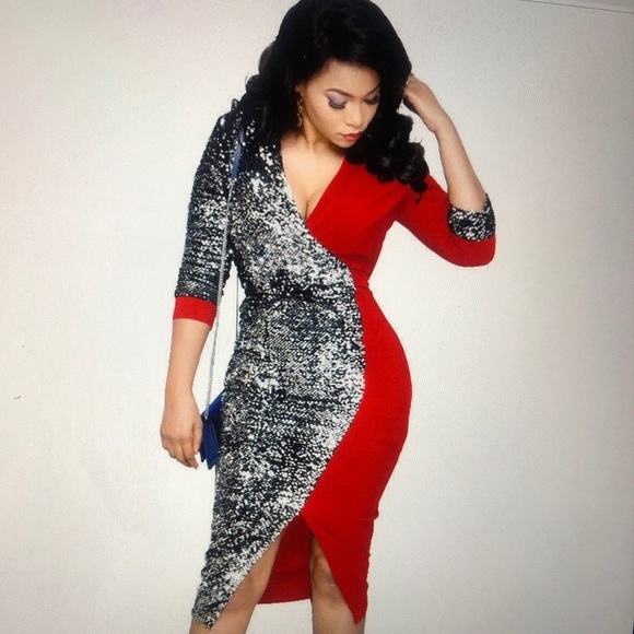 Check out this gorgeous red and silver sequin wrap dress! It makes the perfect statement piece when you want to stand out from the crowd. It’s sexy, form fitting, and delivers celebrity glitz! Features include: *Red and Silver Sequin Design *Wrap dress with flattering V Neck *Pencil skirt fit and length with front split *Zipper back *Red tie at waist to adjust tapper fit to your liking *Size: Large *Material: 90% Polyester, 10% Spandex Comes with protective sleeve bag. Brand NEW!