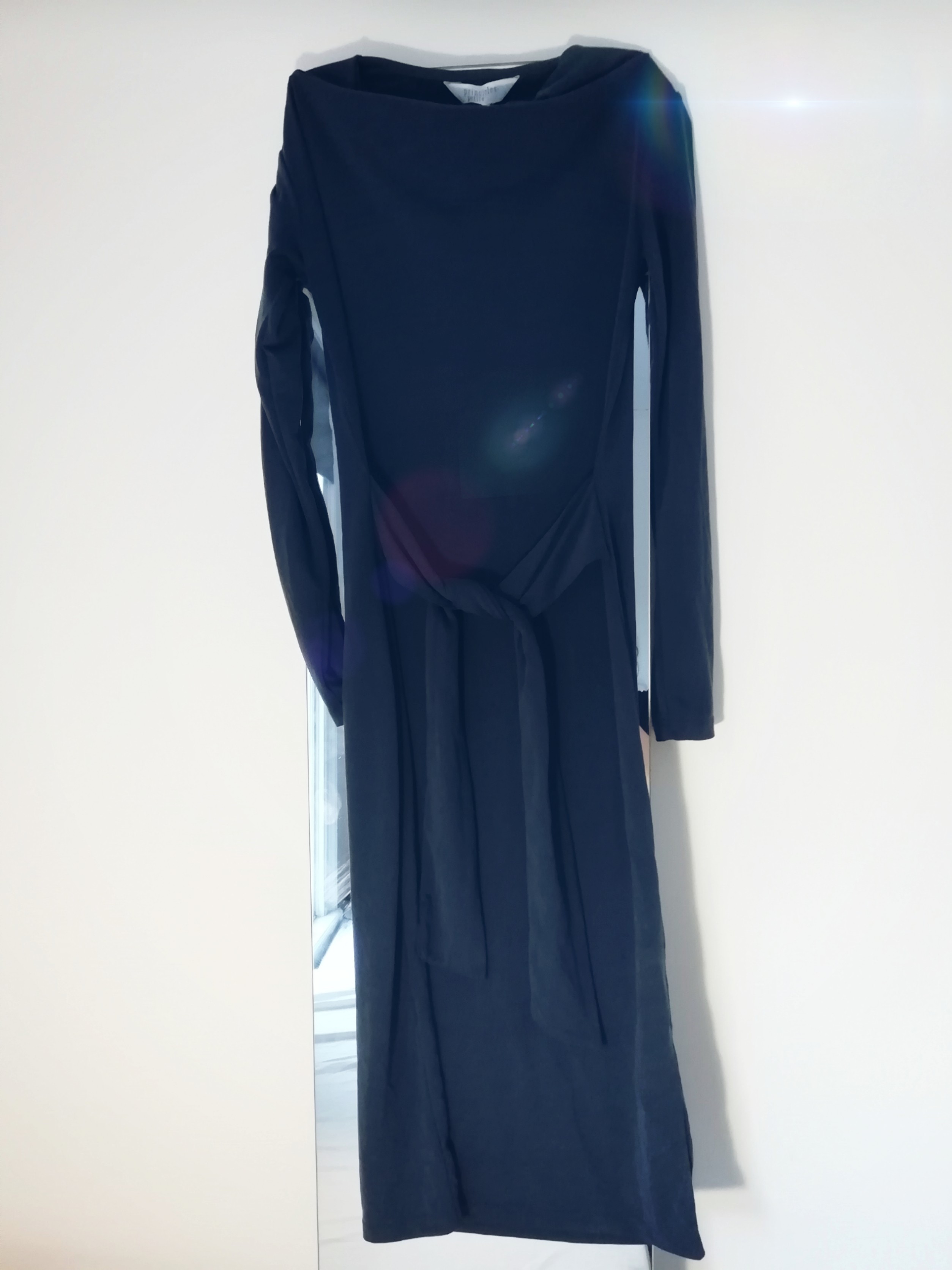 Long blue bodycon dress. Has ties around the waist that can be tied at the front or back. This has never been worn apart from the photos here, so the tag is still attached. Would make a really beautiful evening dress.