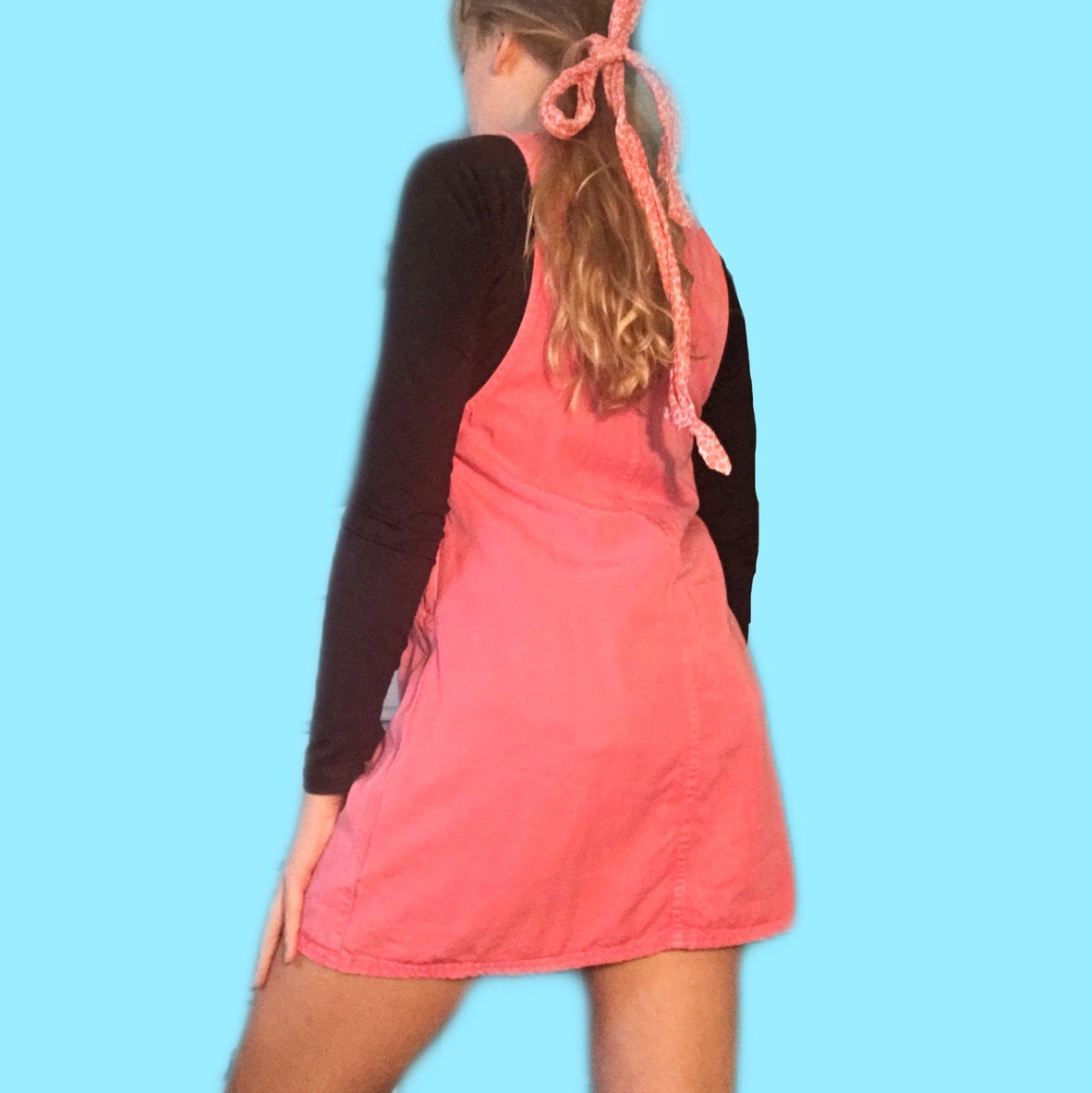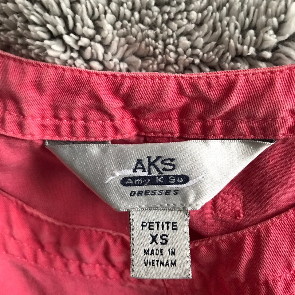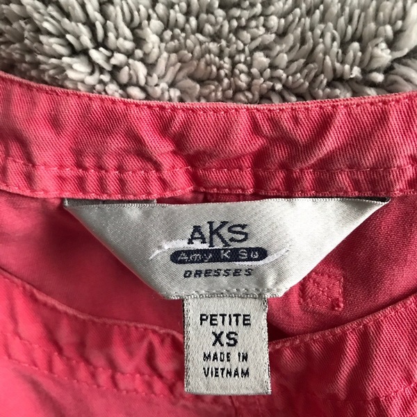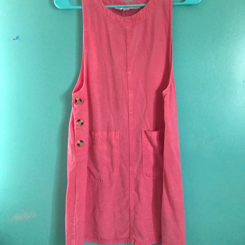 Size says "small petite" but I fit small/medium and it works great. I am 5'7 for reference. I can throw in the little floral belt/hairband accessory, it doesn't go with the dress but it matches well. Can also be used as apron or art smock if interested. Pink/salmon color, 3 tan/brown buttons on each side and two functioning pockets in front. Thrifted dress but good shape. Discolorations/small paint splatter are pictured. Not noticeable when worn. I wish I wore it more. Very cute with black or white shirt layered underneath.