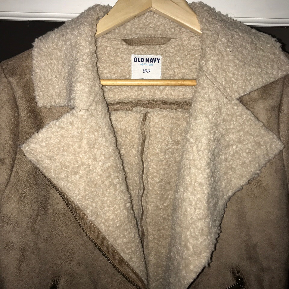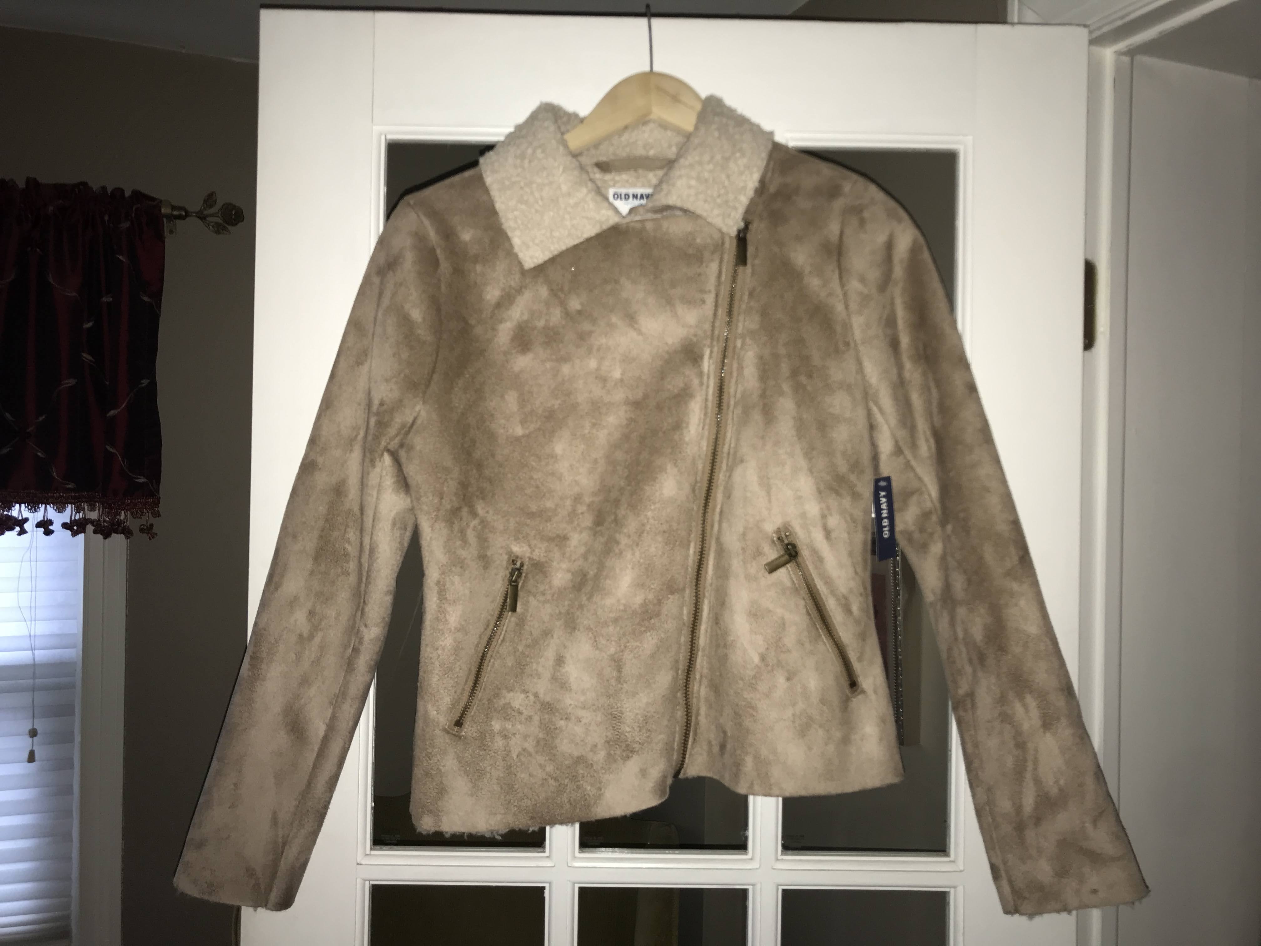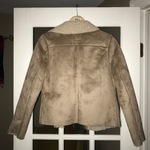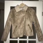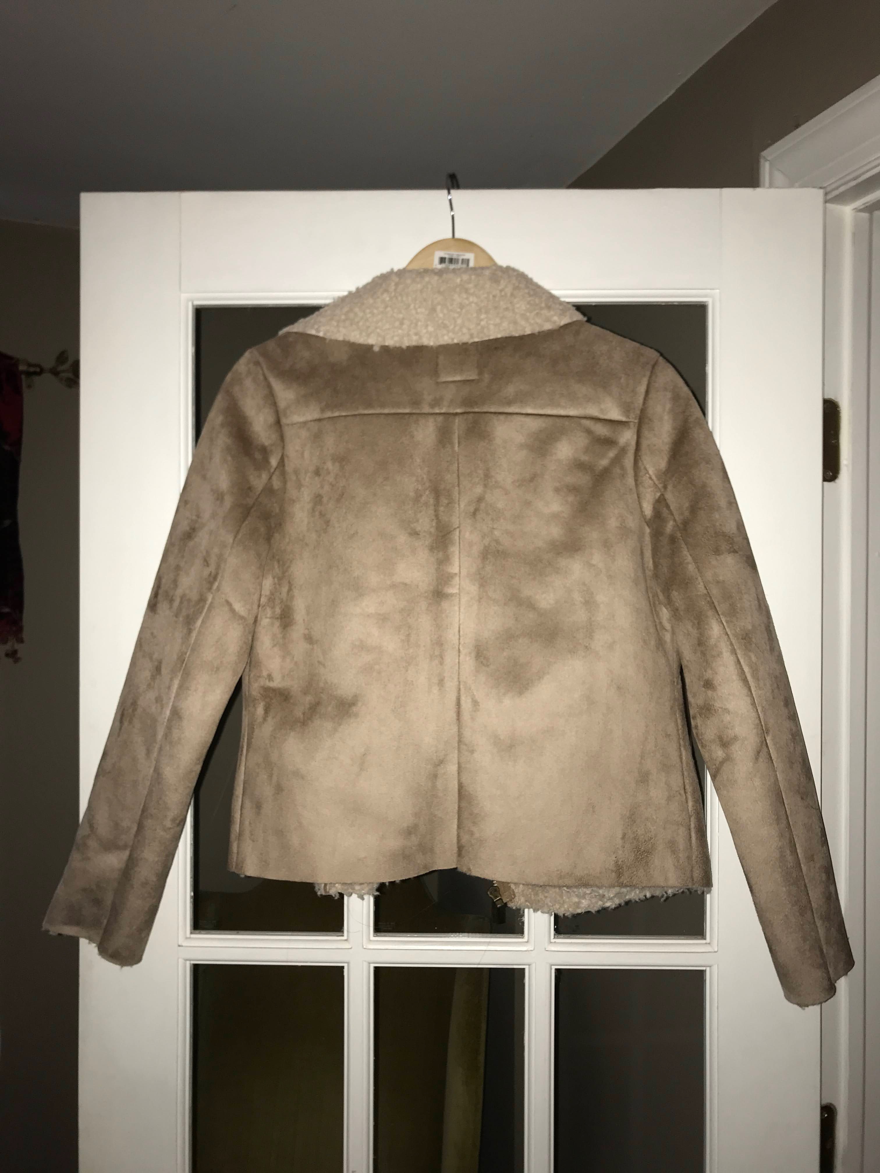 Suede outside tan/light brown with teddy bear fuzzy inside. Asymmetrical zipper and zipper pockets. Never worn, still has tags. Size S/P/P fits small. Original price says $64.94. No issues, just never really fit my style.