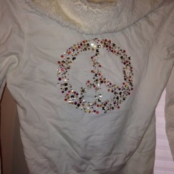 size small white zip up jacket with faux fur trim instead of a hoodie from old navy. peace sign made of rhinestones on the back. its only a little wrinkled after being in my closet for so long :P its never been worn out! :)