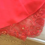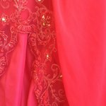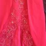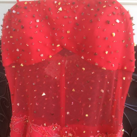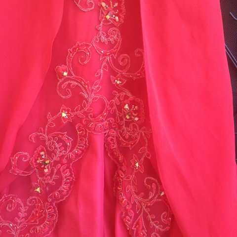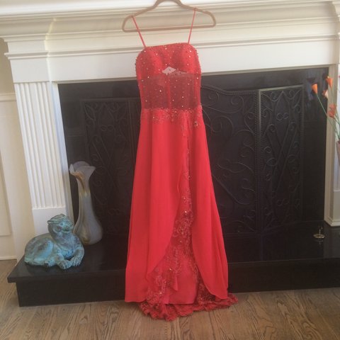 Stunning red gown, I believe this is size four, but would be better to check against measurements to see. Dress was only worn to take photos in, it isn't in perfect condition, I believe on the bottom hem, I'd have to look to find imperfections, you can't see them unless you are looking for them. Icomes from smoking home