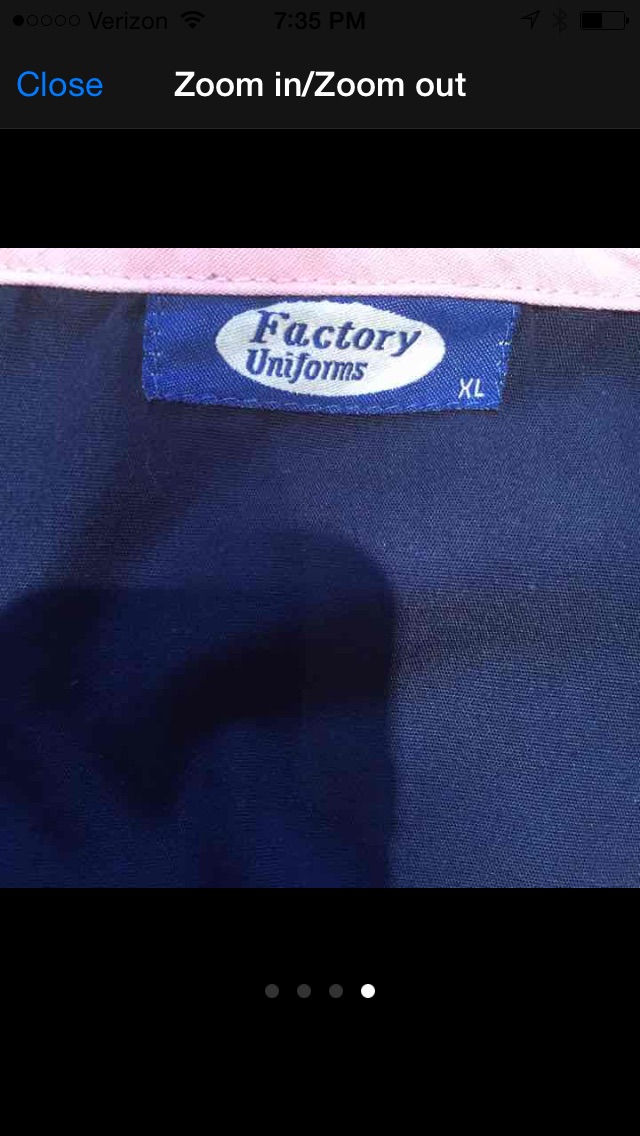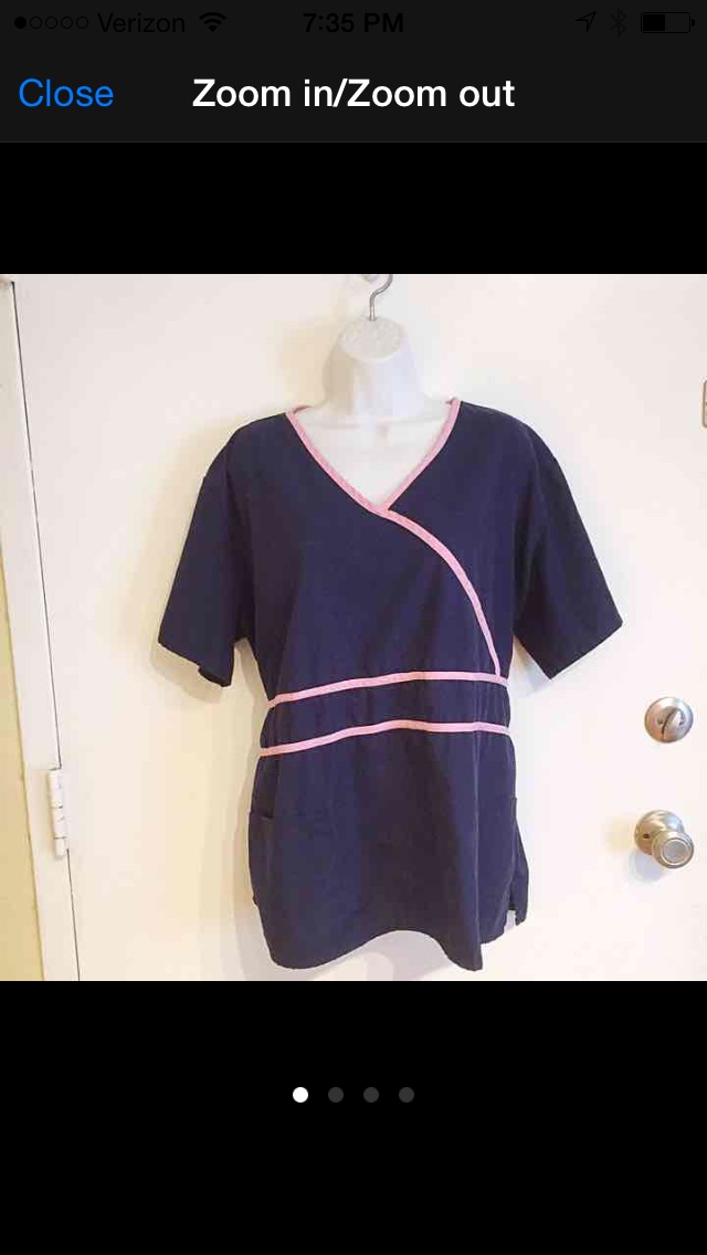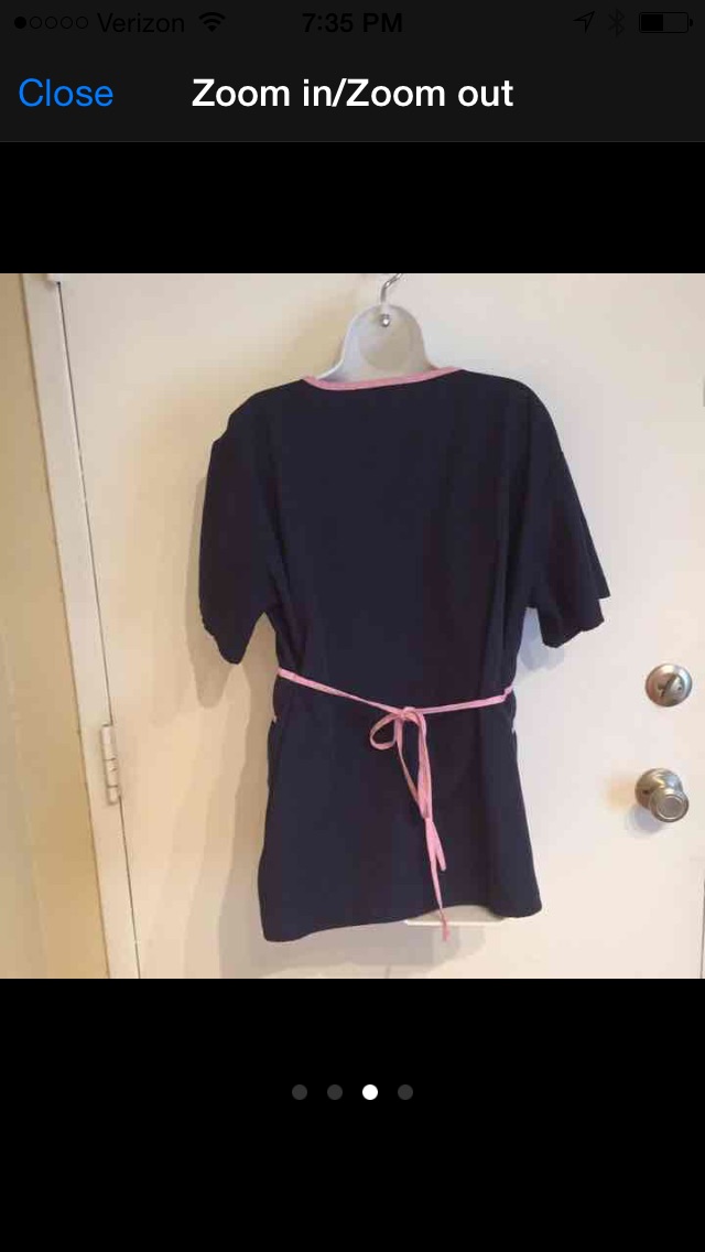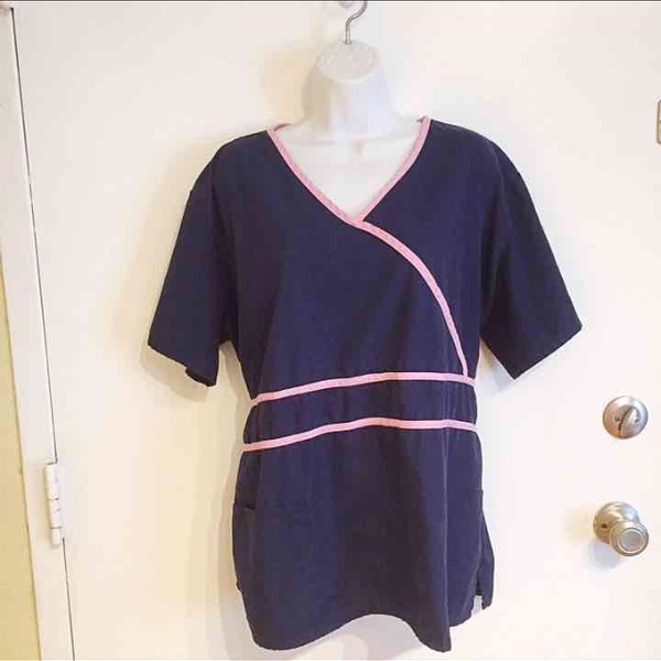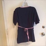Navy blue with pink trim/tie. V neck. Flattering and comfortable. Size XL. Smoke and pet free home