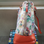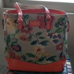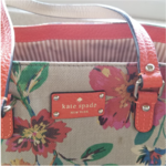 Large orange floral Kate Spade tote handbag. Authintic Kate Spade brand. Accented by orange leather handles and bottom. The base has metal studs on each corner for protecting leather and added stability. Easily fits a tablet, laptop or doubles as overnite or travel bag.