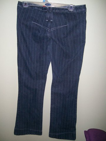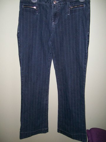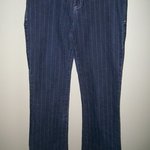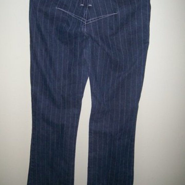 Vertical stripped pattern, dark blue Bebe brand jeans. Zipper front pockets and no back pockets. Hardly ever worn. Flare pant leg. Size 24.