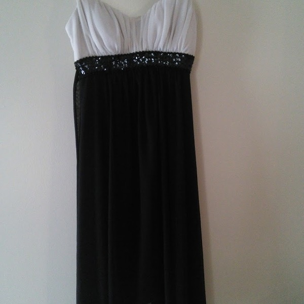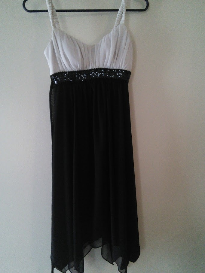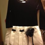 Black top with white bubble skirt. this is very cute. long sleeves and the skirt has a black ribbon around the waist and a black fabric rose on the side.
