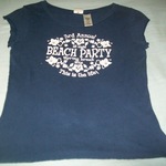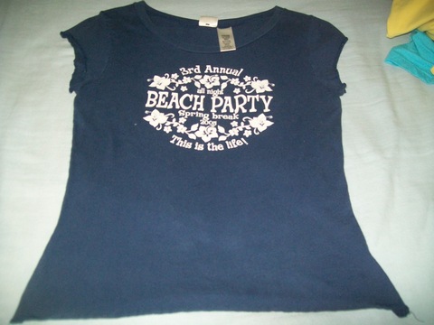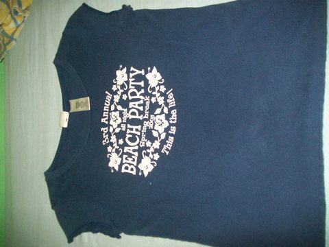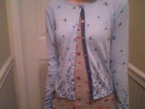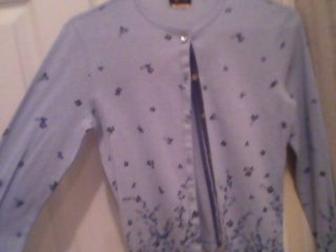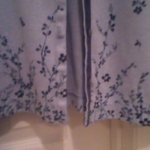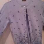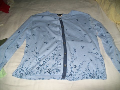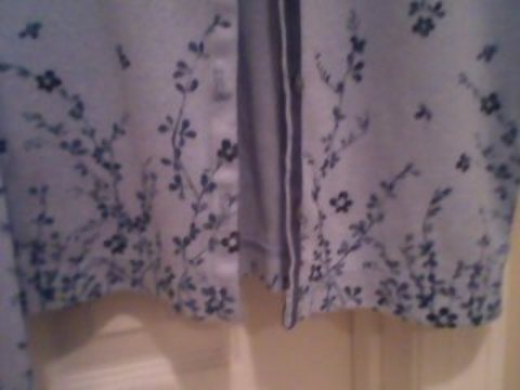 Ok its blue/purple and its button up.It was flowers on it and at the bottom more flowers:)