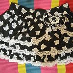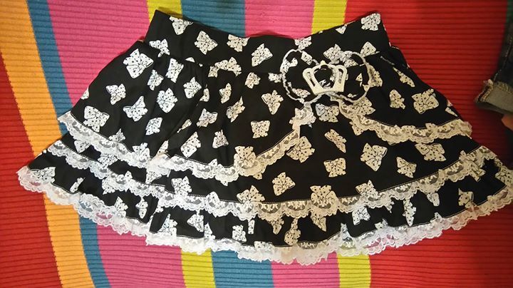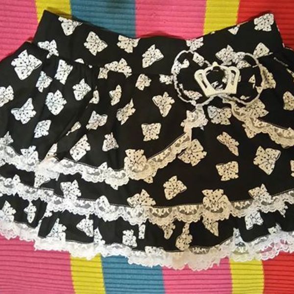 Cute black Lolita inspired skirt with white bow print and white lace and ruffles. Cute crown accessory. Very true to size, a bit tight. Pretty short as well, may have to wear something underneath it. Does have a slight thin petticoat inside. Amazing shape!