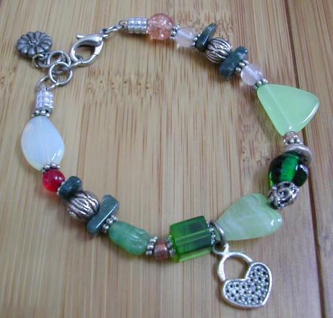 Bead anklet or bracelet made of art glass, semi-precious stones and metal beads and charms, lobster claw clasp, total length is about 8.5 inches but can be made smaller with adjustable links.
