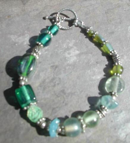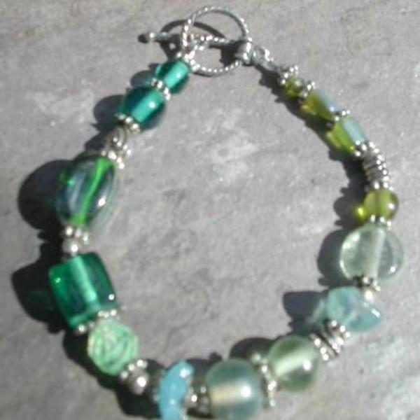 Blue and green glass beads, silvertone beads and toggle clasp, 7.5" total length