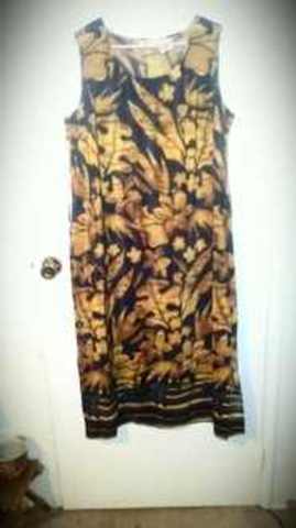 brown with light yellow and light blue flower design on top and bottom. has thin gold string that goes through the middle section that makes the dress look kind of sparkly. Adjustable straps. knee length. lace trim at the bottom. One of the plastic circle on the back of the strap broke so I replaced it with a small circle necklace clasp. it is not noticeable but I can take a picture of it if you would like.