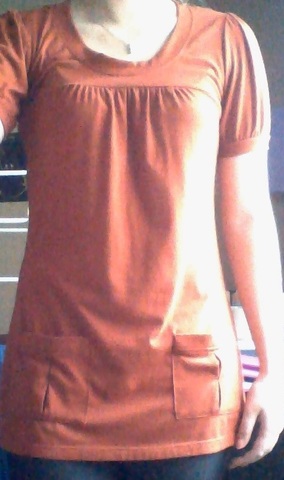 cute burnt orange top with sleeves that kind of puff but not too much. two little detail pockets on front. seem above breast. tunic style. kind of long, comes down almost completely over butt.