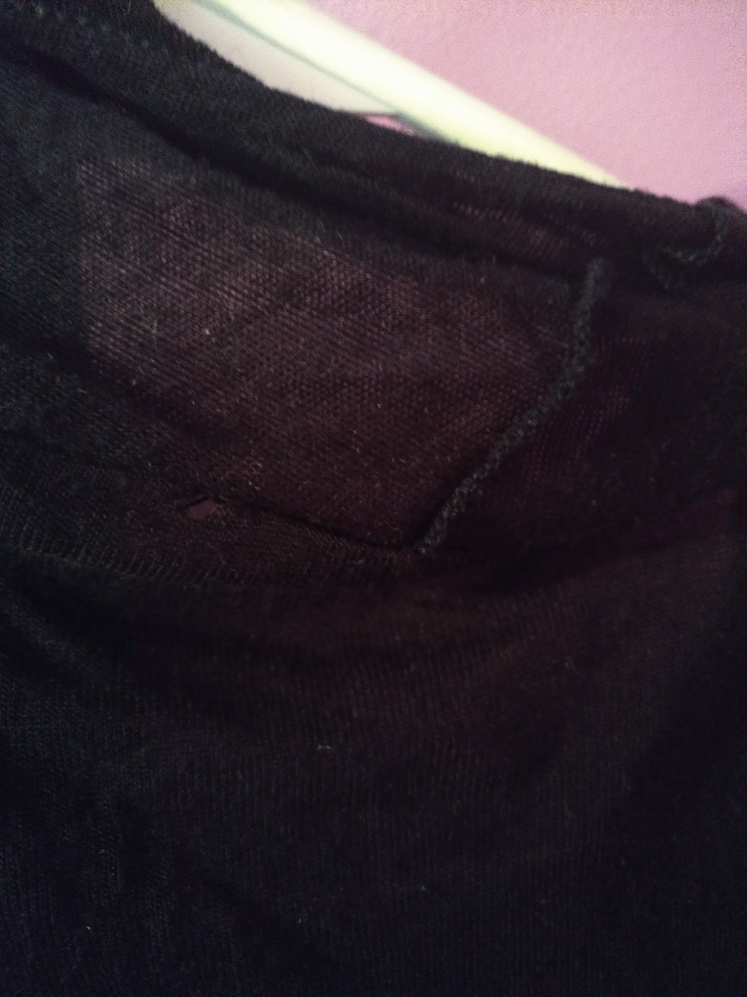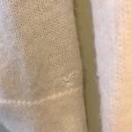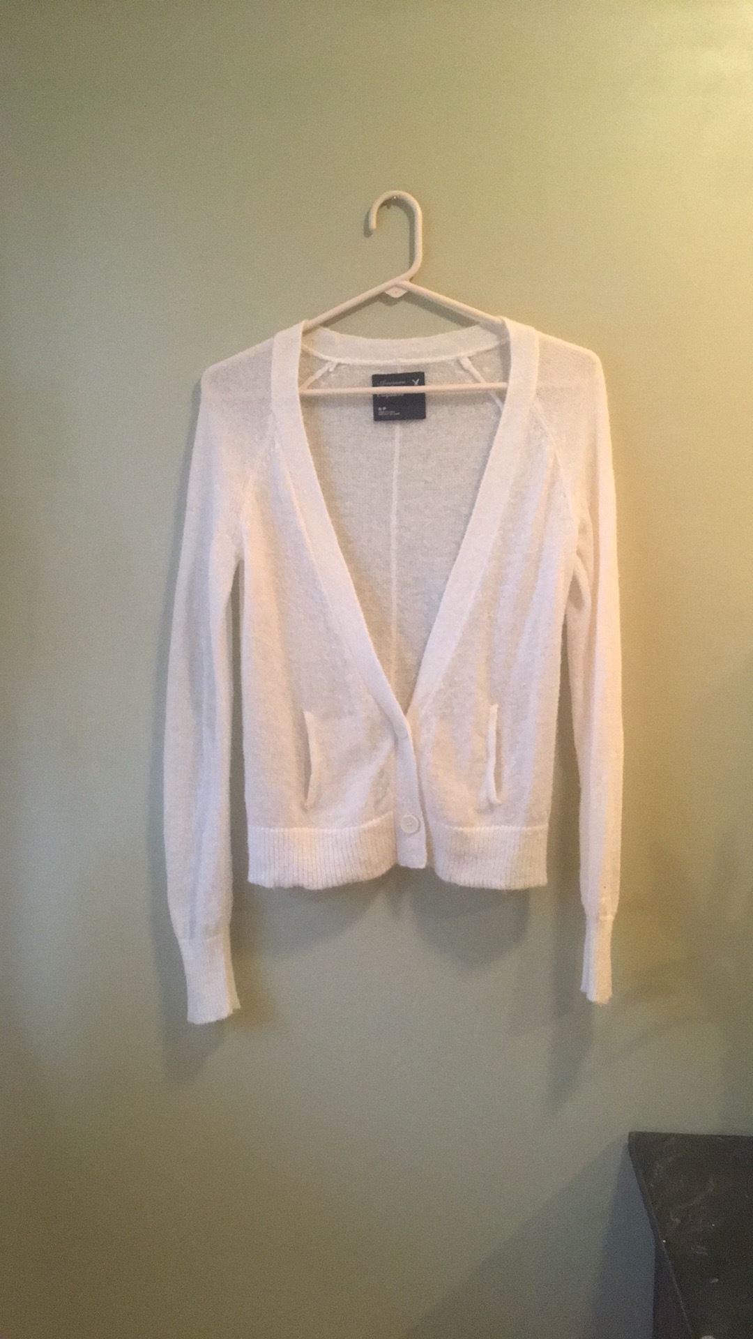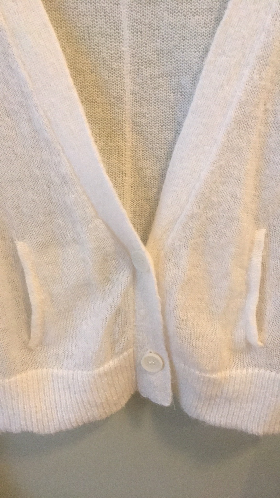 A cute stretchy cardigan/shrug. No visible strains or marks. Has a tiny hole near the neckline, but it's barely noticeable, and can easily be repaired.