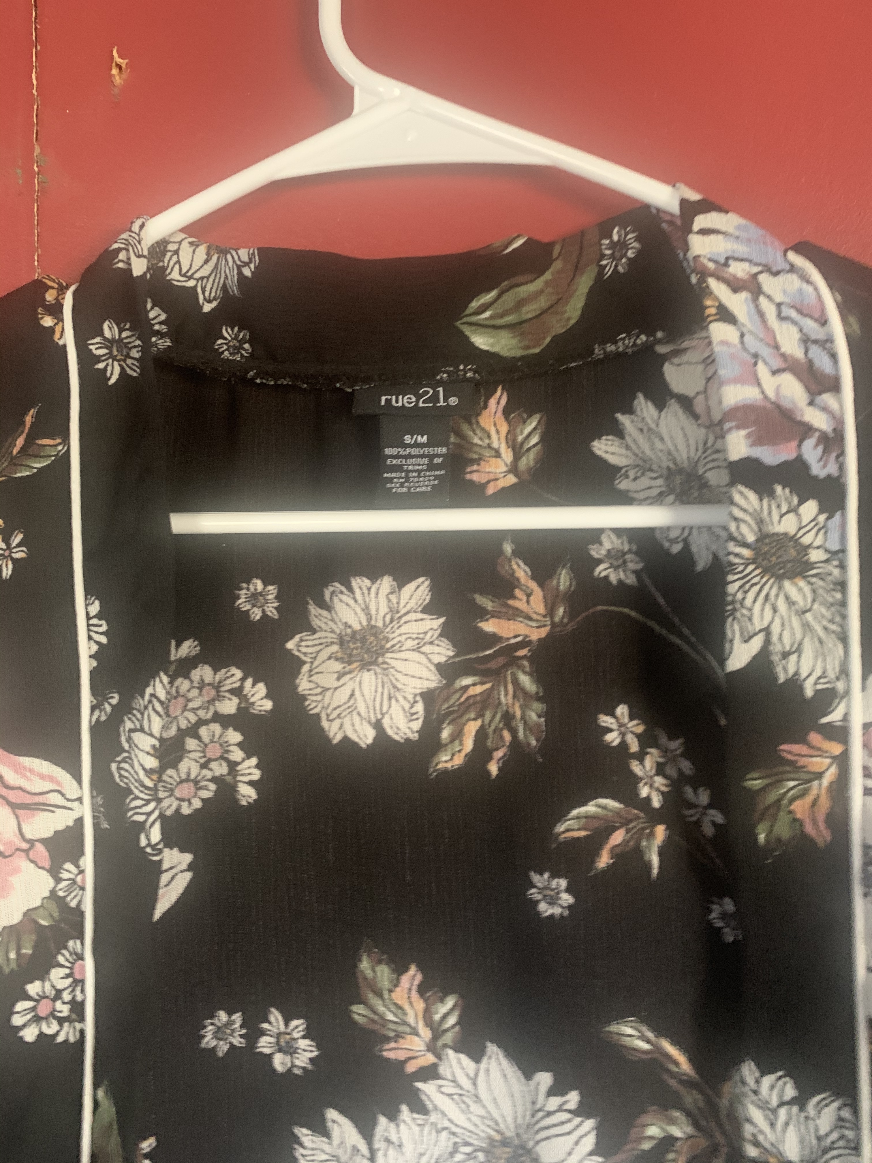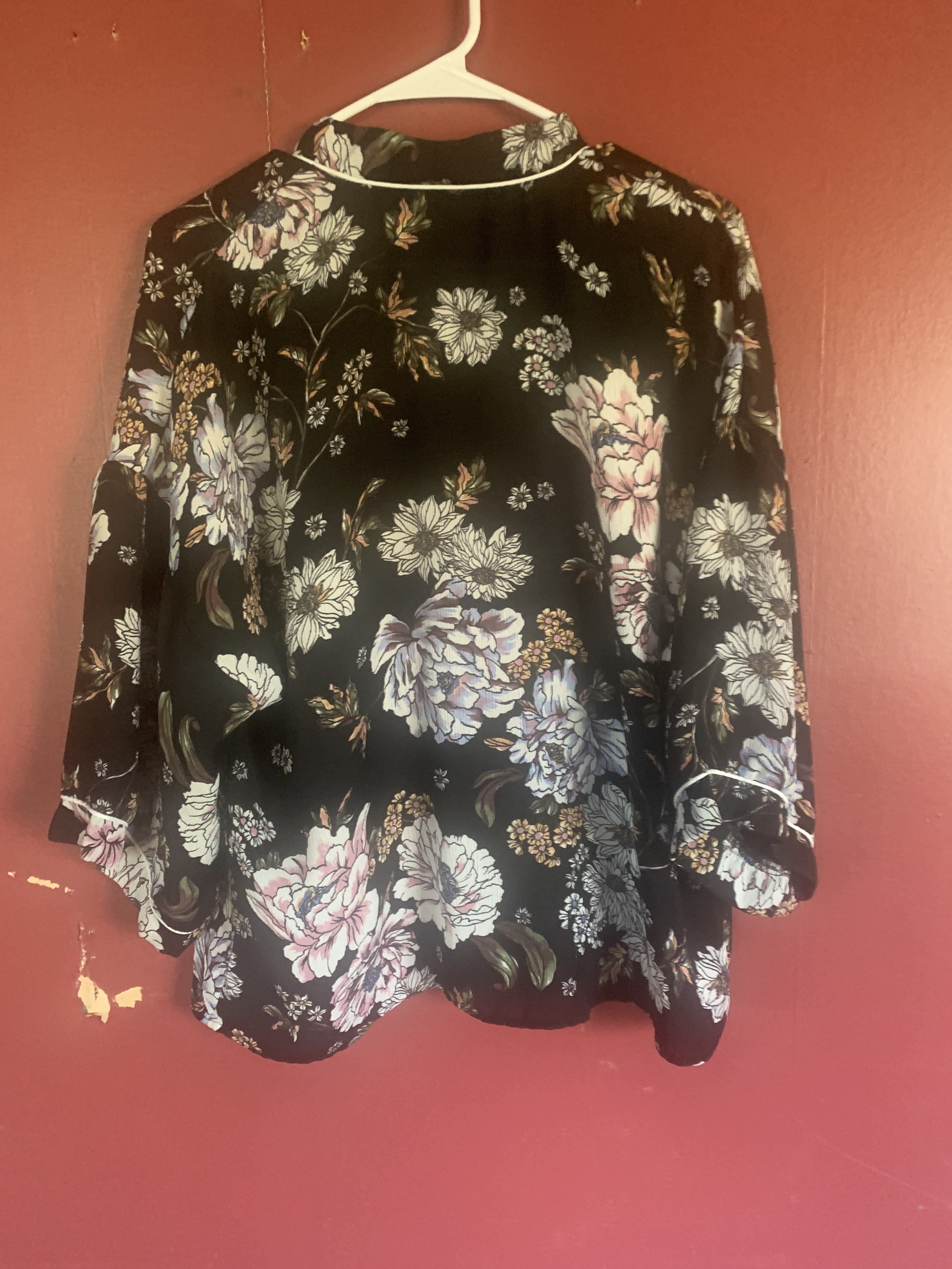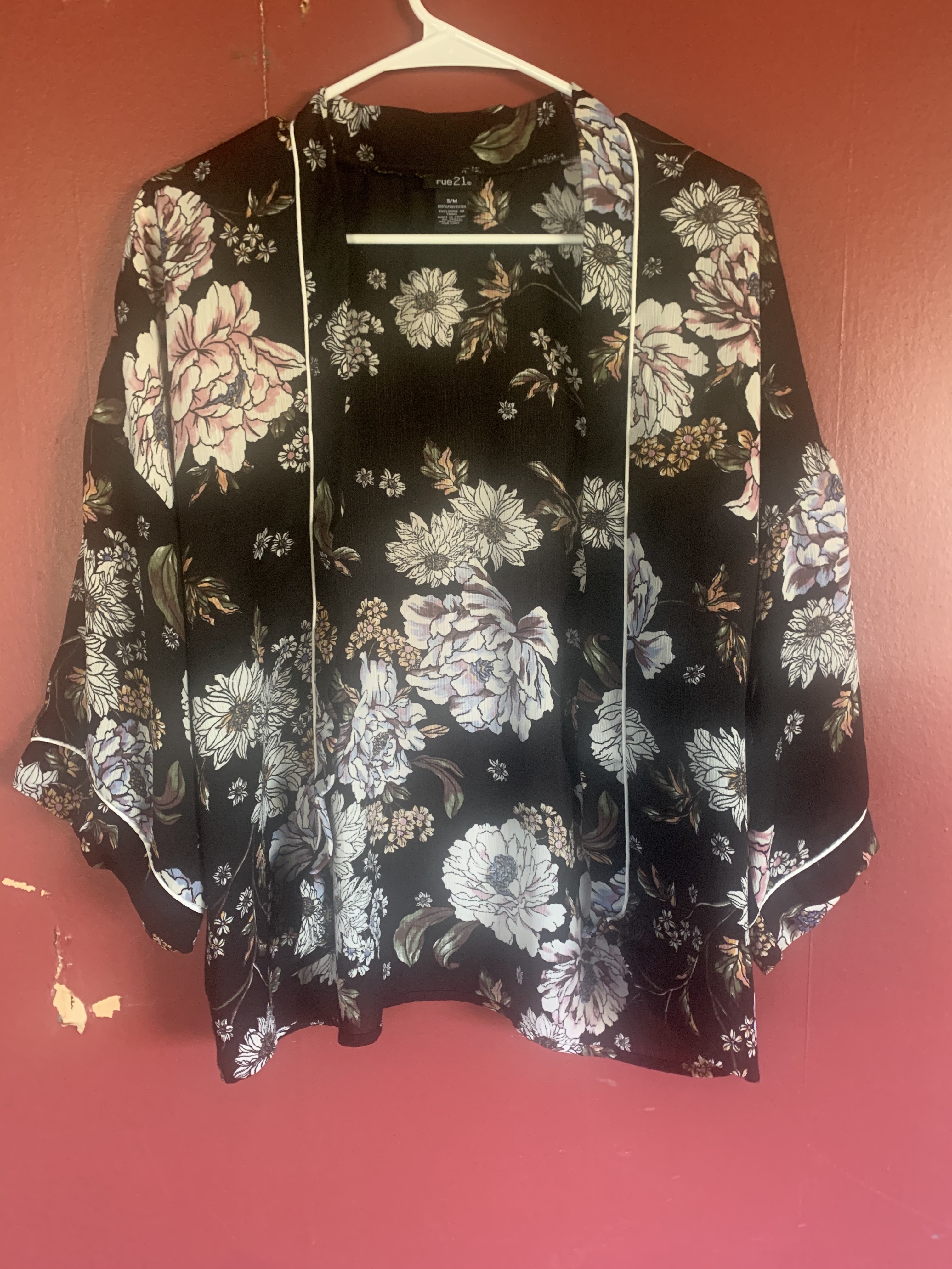 Very cute flowy light flower material super cute over a dress or even a tank top or simple basic blouse.