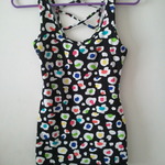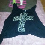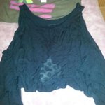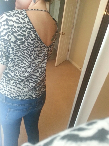 Worn lightly, cheetah print top by express. Its almost oversized and flowy. It has a strap across the back to keep the shirt on your shoulders.