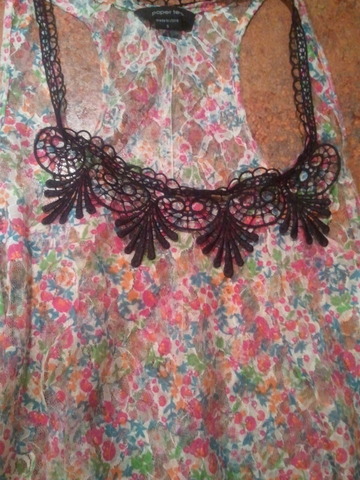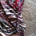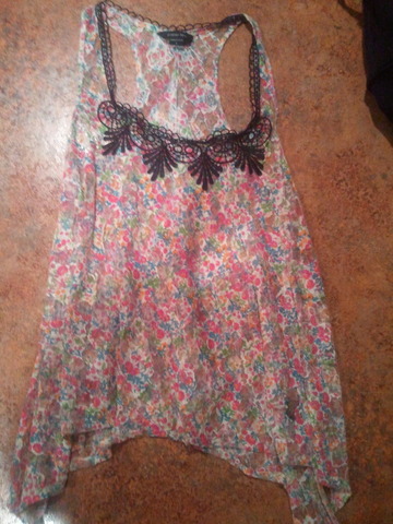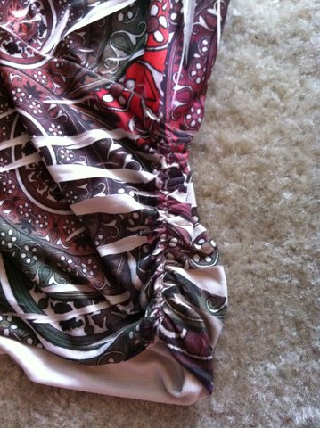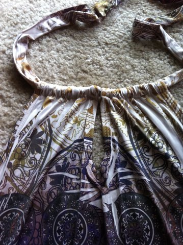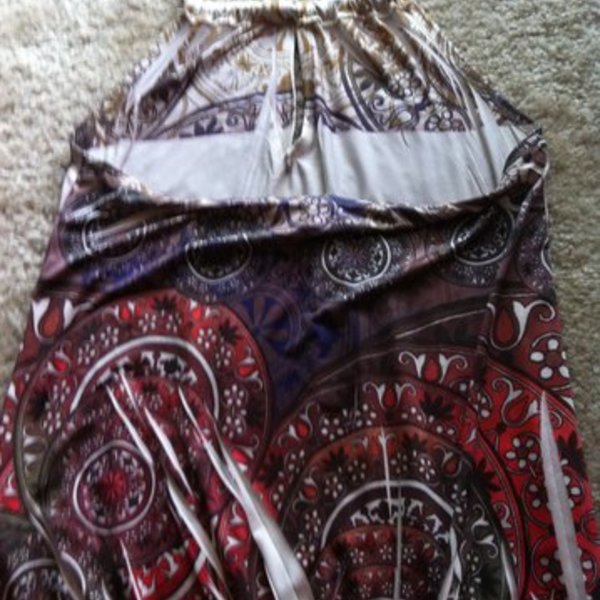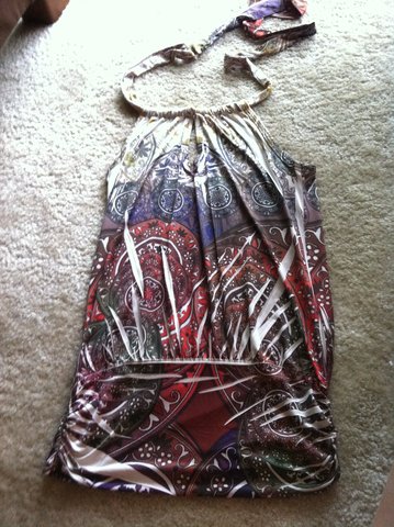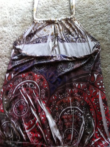 Perfect condition as far as I can tell, I just want something new. Several colors (orange, green, maroons, white, purple..) in a cool design. Ties up behind the neck and has a key hole at the neck. shows off the upper back. has cinching around the bottom.