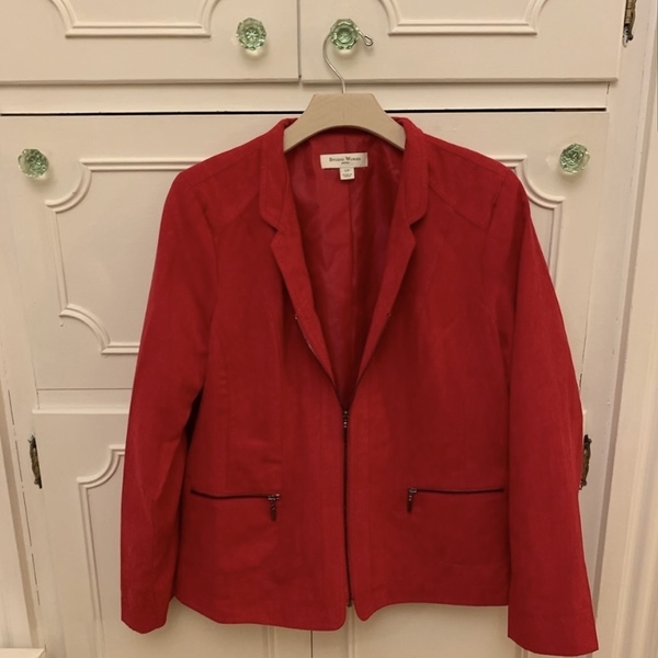 solid red lightweight jacket made of a soft, faux suede material. Long sleeves with a zipper and pockets Measurements Pit to pit: 20.5 in Length: 24 in