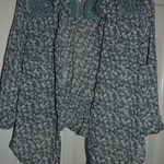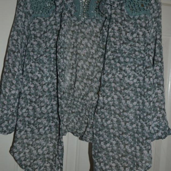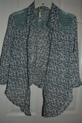 thin top with adjustable 1/2 sleeves that can also be worn as 3/4 sleeves. crochet on the shoulders and along the top of the back. tag says large, but fits more like a medium. i'm petite and it's almost fitted on me. the buttons stop near the middle of the shirt so you can tie it at the bottom.
