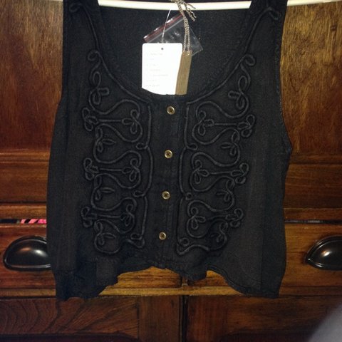 Not sure if I want to get rid of this yet...it's just a little too cropped for my liking. But I love the embroidery! Tagged a M but could fit XS-S depending on how cropped you like it. I can post pictures of what it looks like on just ask(: