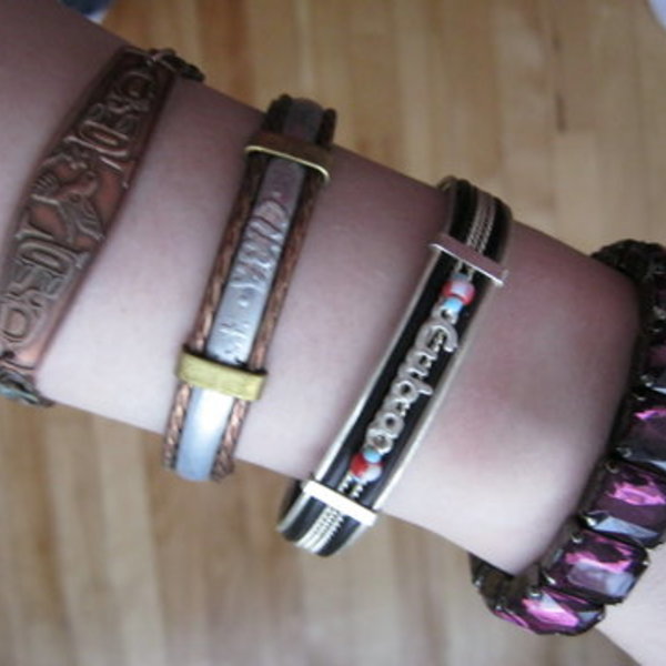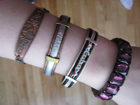 4 Different bracelets, take one or take them as a lot! In order from the picture left to right they are: -Hammered copper chain handmade bracelet with a hummingbird native design on the copper "plate" -Copper and other metal CUBA bracelet. This bracelet is a hard type of bracelet, it does not have a chain, it just slides on. -Reclaimed materials CUBA bracelet. Made from reclaimed materials, has a hook closure, not chain similar to above. -Purple gem bracelet. Stretchy.