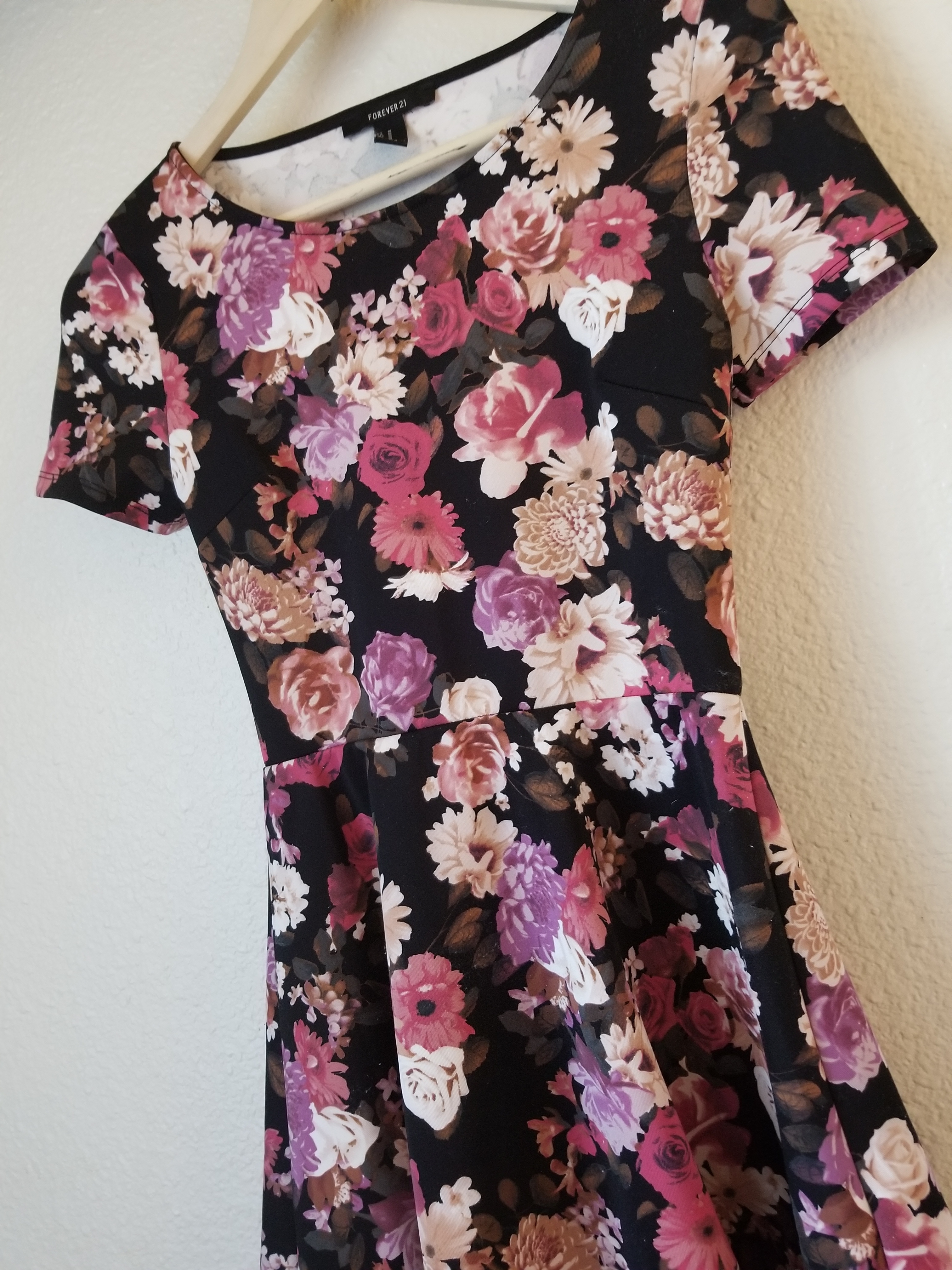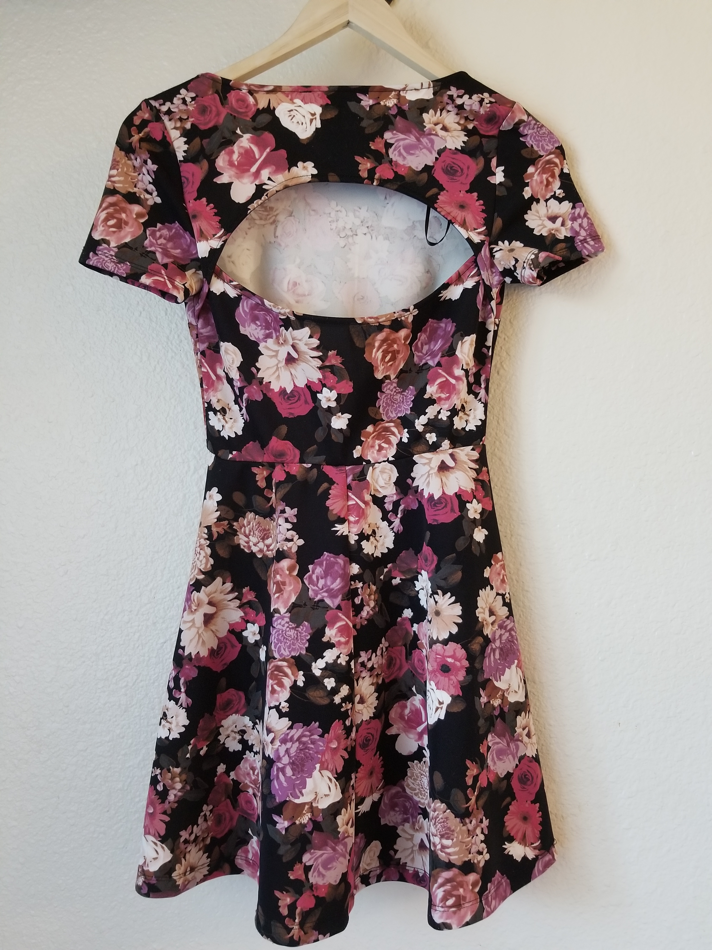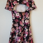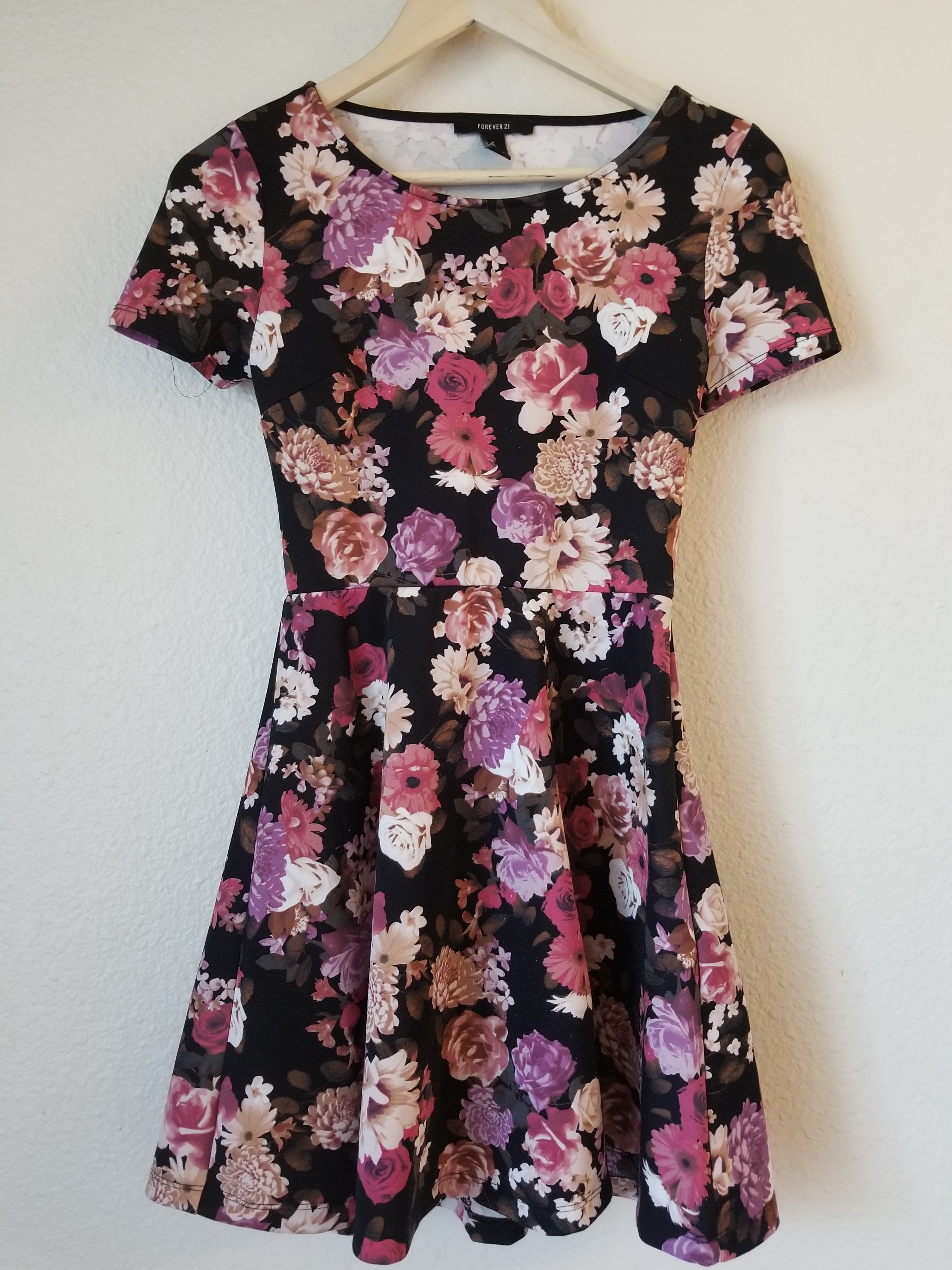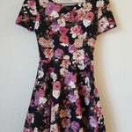 Forever 21 floral skater dress, circle skirt, not too short, has a cute cutout in the back, short sleeved, really flattering... looks great with heels or trainers, fairly stretchy material, really beautiful dress