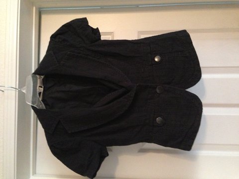 In excellent condition, very professional looking. Very short sleeves, the buttons are a little rubbed off texture. Purchased this at Nordstrom's! Very nice blazer, with the illusion that there is a vest underneath but it's just attached. Ughh I love it but no longer fits!
