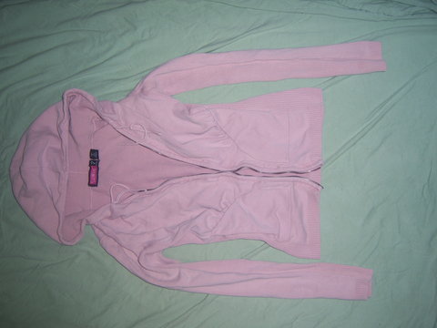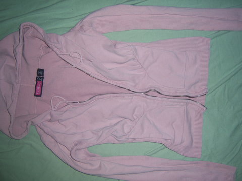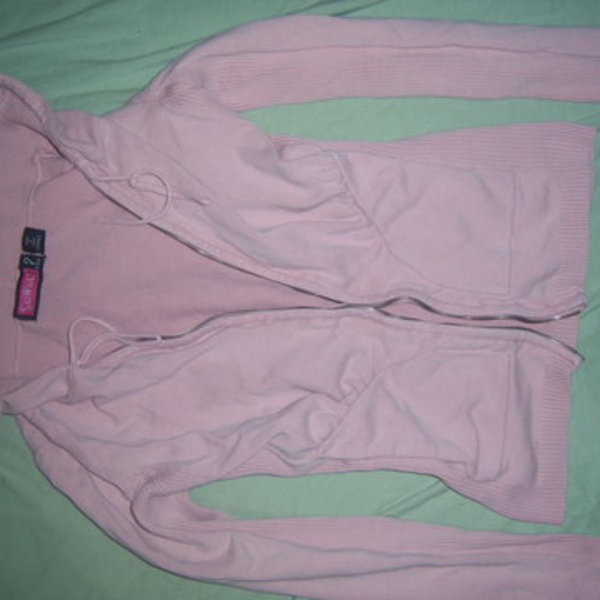 Here's a pink sweater in pink color size SMALL. Very soft stretchable fabric. Tight fitting. worn quite a bit, and missing the front zipper. Still have lots of life left. Show slight piling through-out sweater.