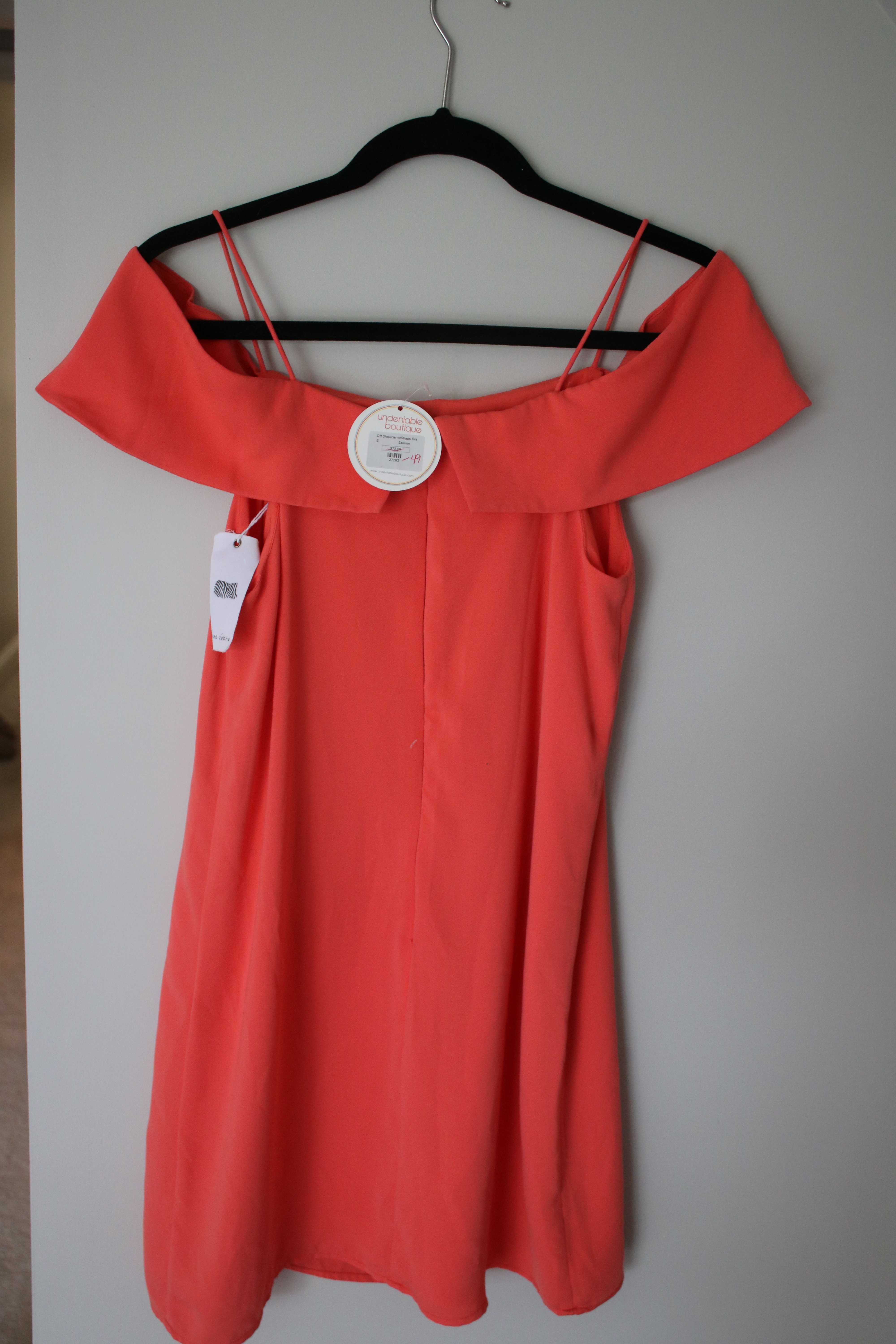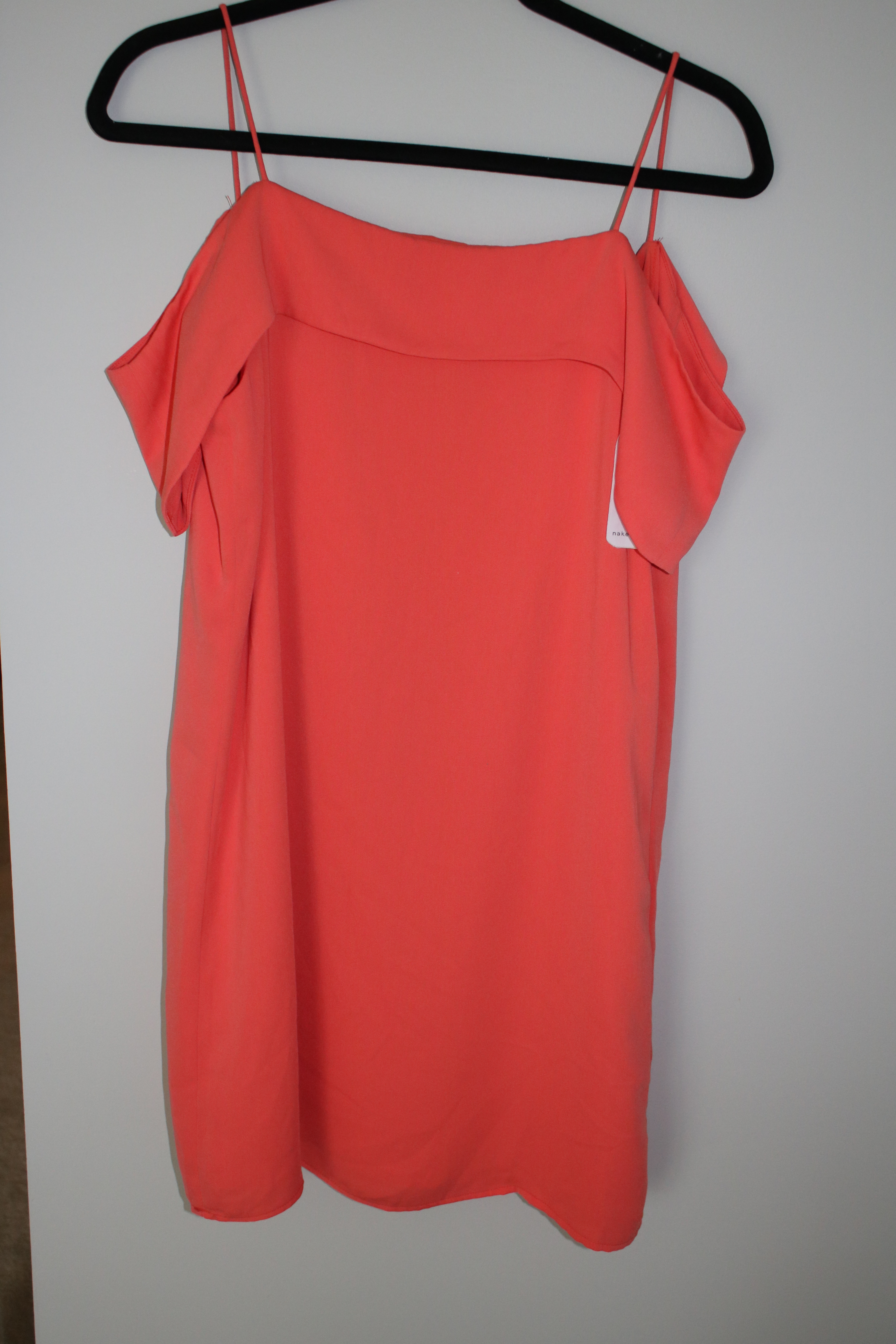 This dress is very flattering and definitely unique. Features off the shoulder "sleeping-beauty dress" straps. Tag still attached.
