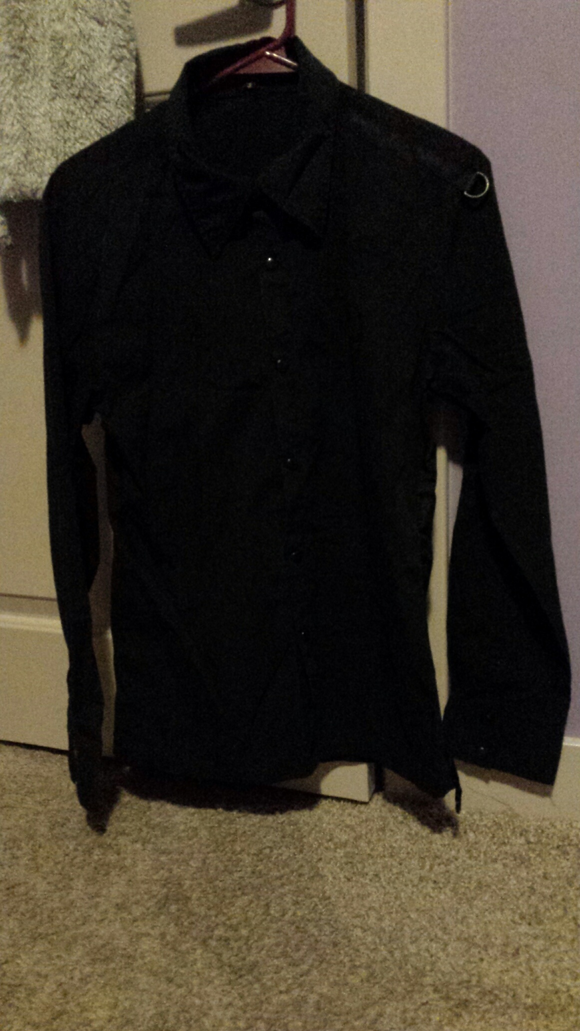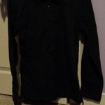 This is a button up black dress t-shirt with black race stripe accents down one side. Nicely fitted. Brand name is ZOOM