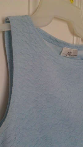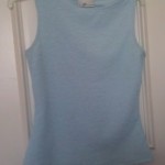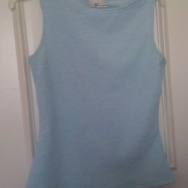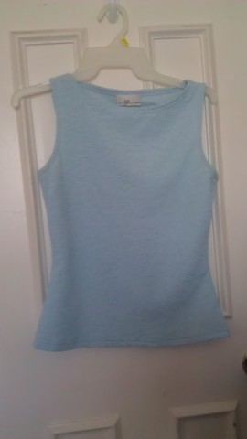 This tank is Small to Medium. It is sky blue. From the detail photo you can see the texture. This is great to wear with dress pants or skirt and goes fabulous under a jacket.