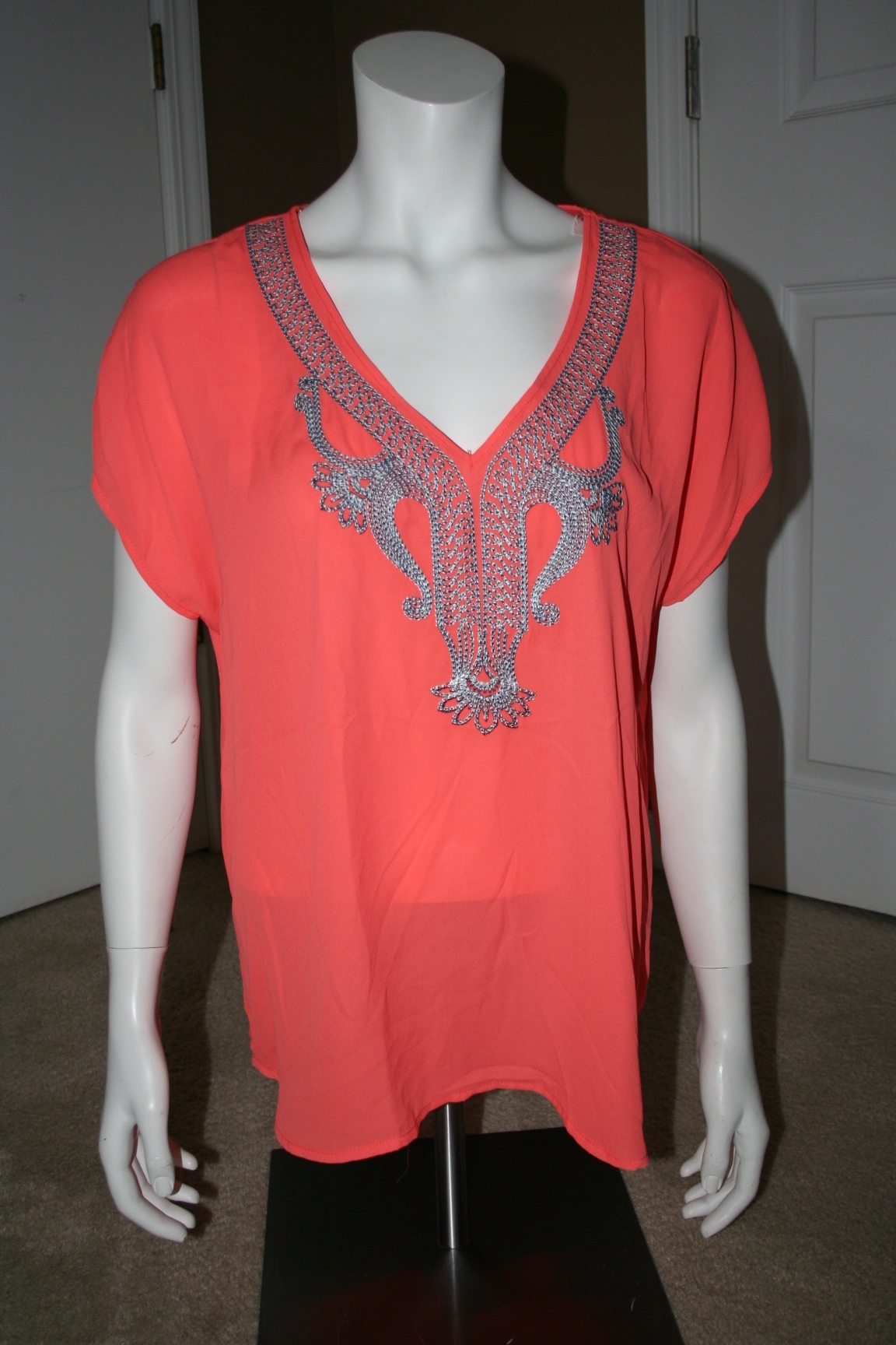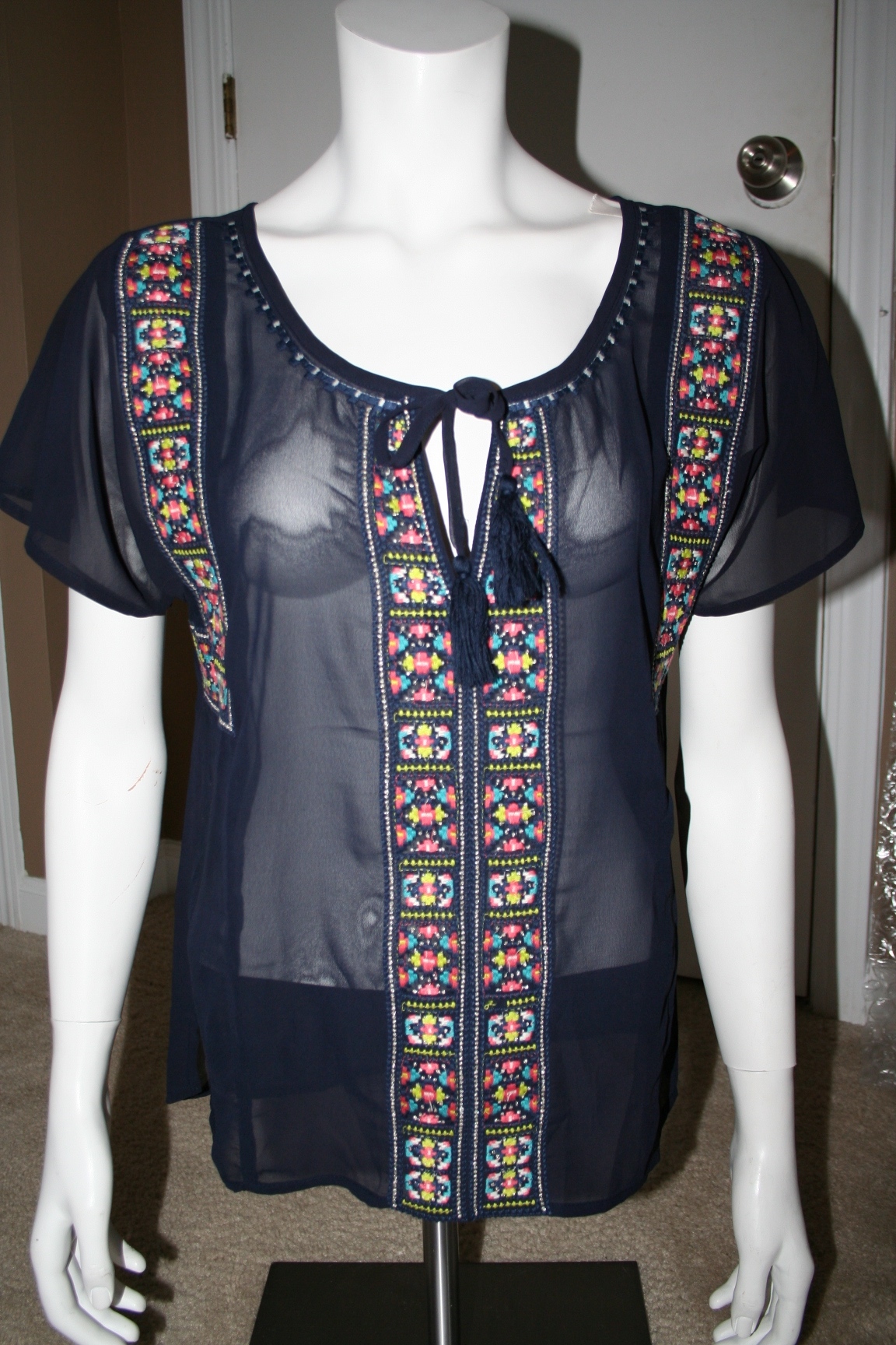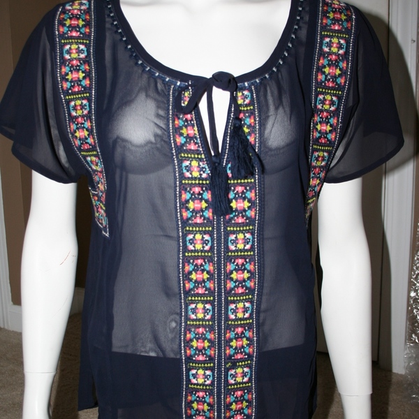 This top is so so cute, I just can't fit into it anymore. Super sheer, so a tank is a must. The picture doesn't do it justice. The embroidery is amazing.