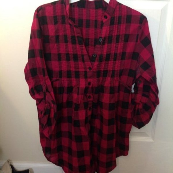Never worn pink & black button up flannel. Has strings to tie in the back and the bottom is very flowy. Sleeves can be put down and I think they're half sleeves but I'm not too sure.
