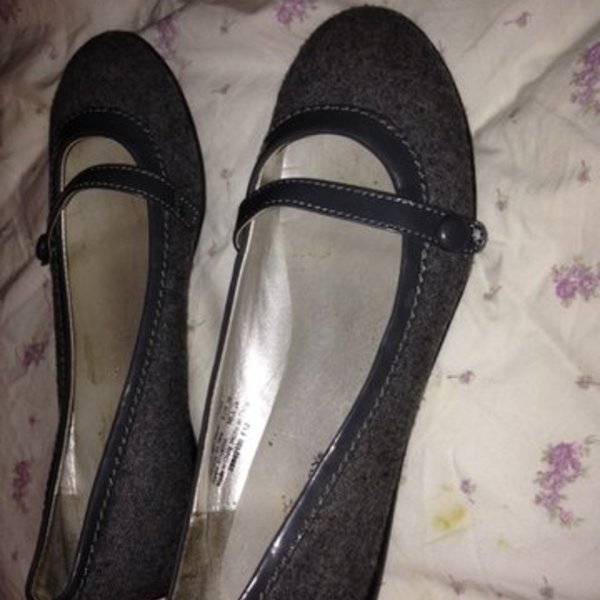 Cute gray flats! Excellent condition, only wore to work twice. They have a small wedge heel, about an inch. Ankle strap. Size 8.5. True to size. Purchased for $30. Brand is Seychelles
