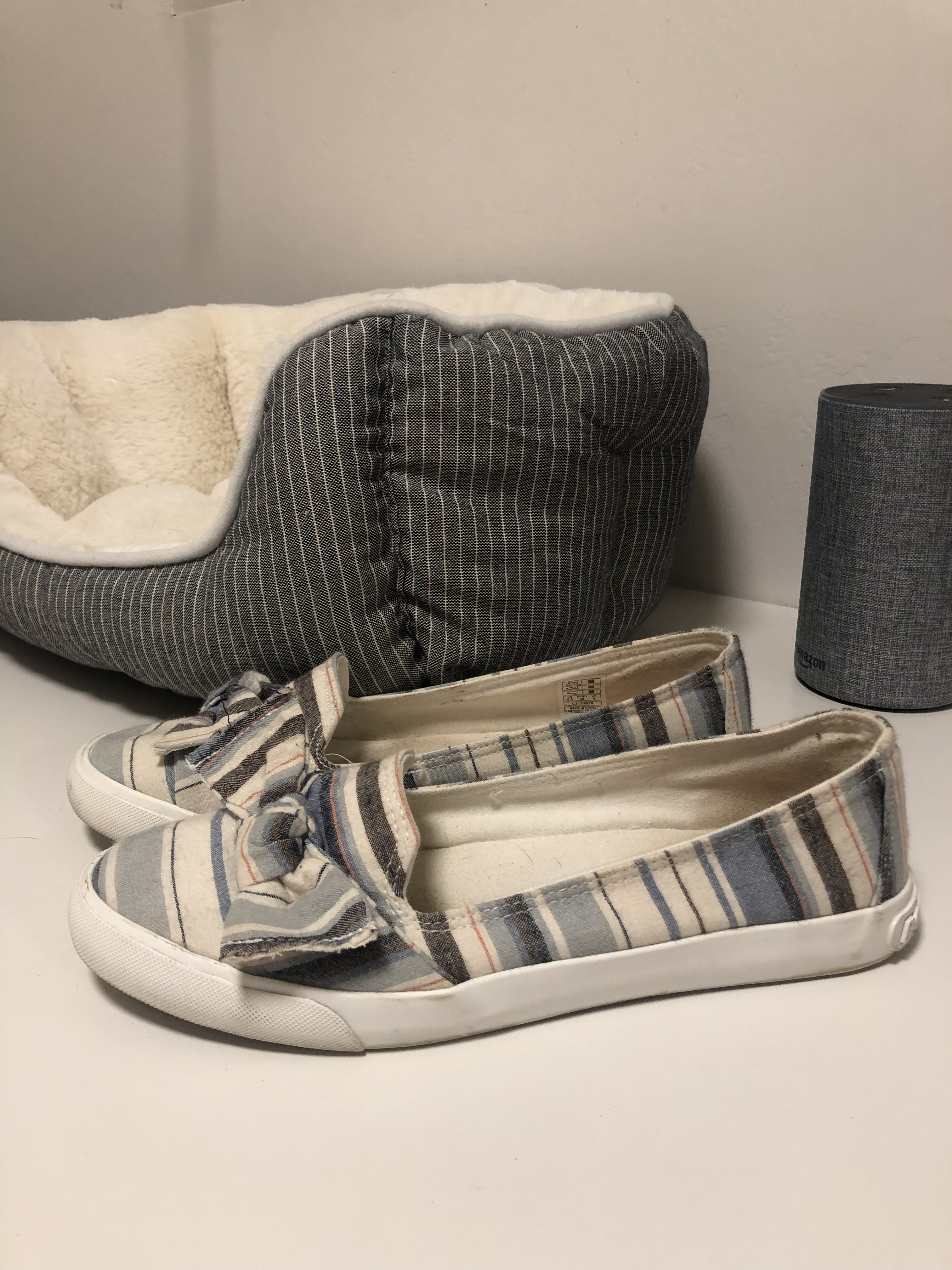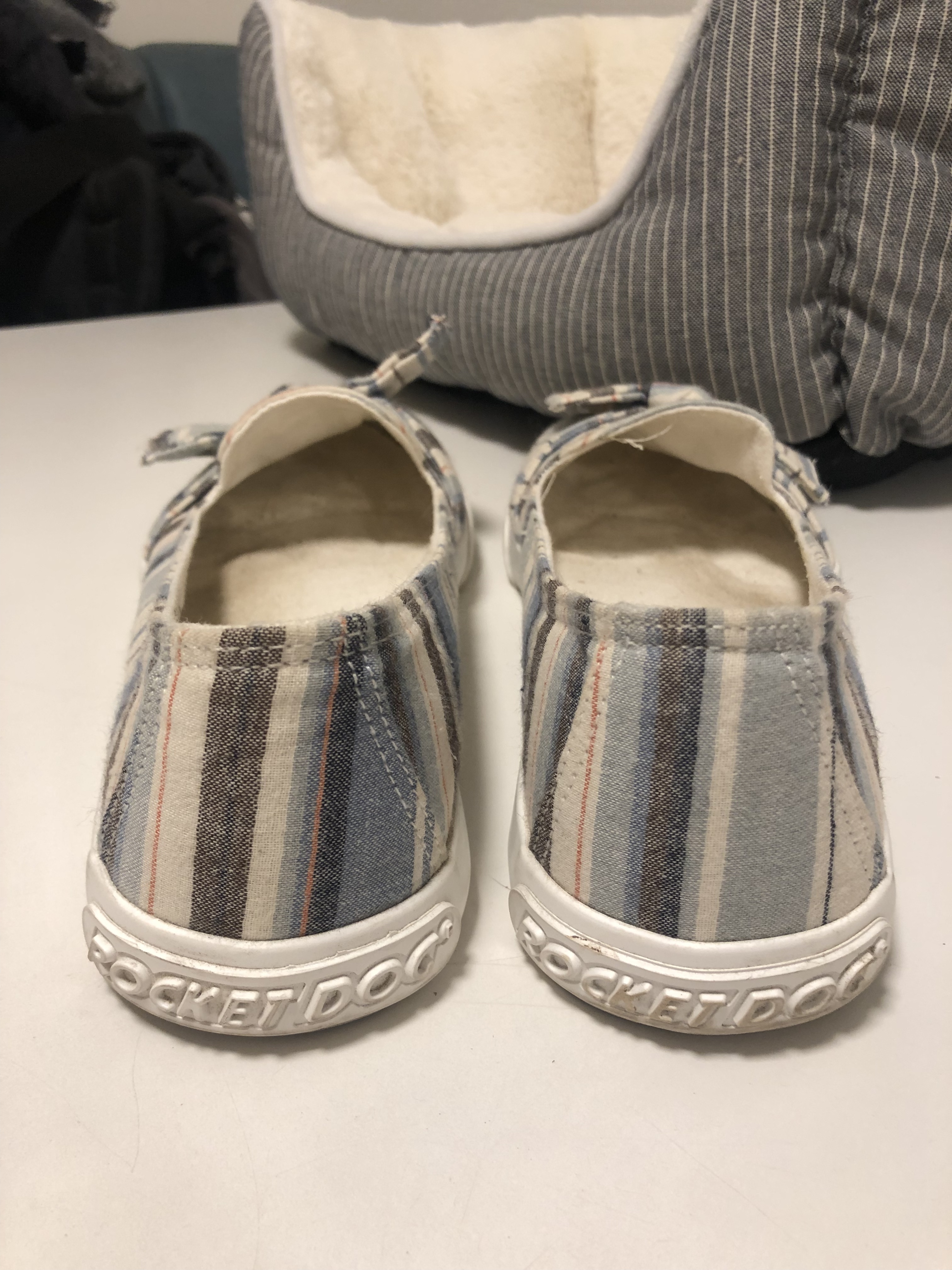Cute flats by airwalk, grey stripes with an adorable heart design on the outsides of the heels. They have seen better days so I put "Meh" but still have some life in them and they're really cute :) Size 6 1/2