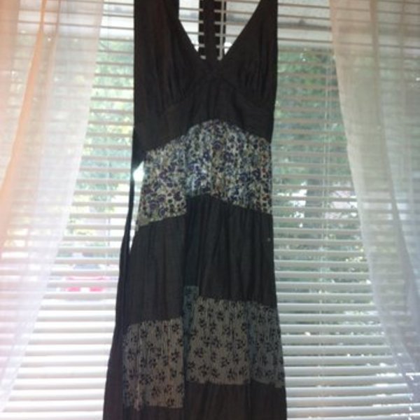only wore once with cowgirl boots! Halter top. denim-like material. different panels with flower design. kind of flares out at the bottom. love this dress! I just never wear it..