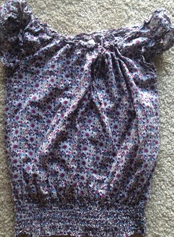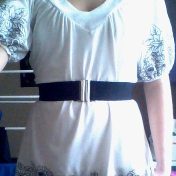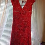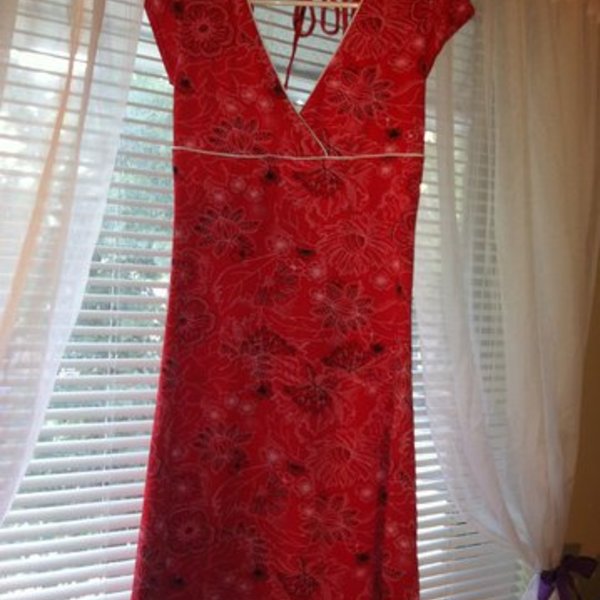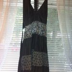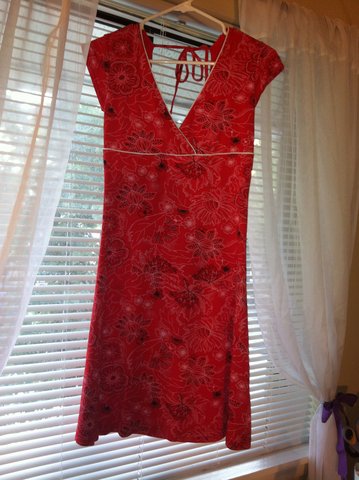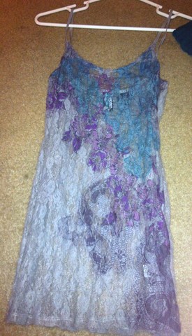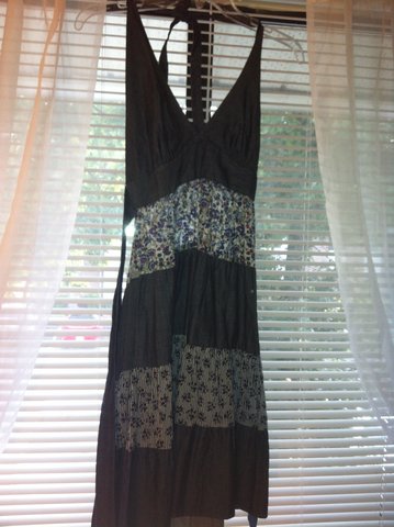Only wore this once but it is too small for me now. it is kind of clingy.. has black and white flower design on it. above knee length. upper back is cut out.