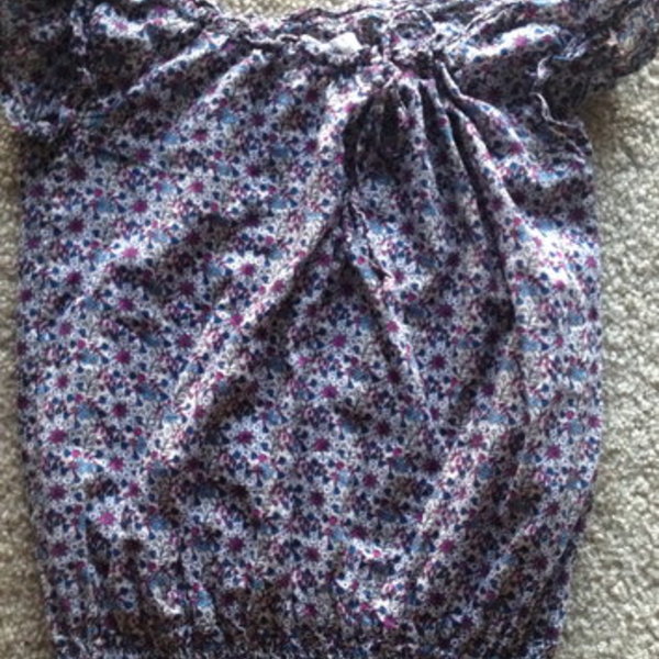 Got this through a trade, but the colors don't really suit me. Pale pinkish-purple with a pattern of light and dark green flowers. V-neck with ruffles along neckline. 37" from shoulder to hem. Ties in back. Mossimo Supply Co. size small, 100% cotton, machine washable, can be run through dryer.