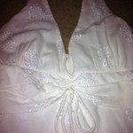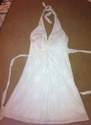 small white halter top dress with stitched flower design. tie in front in back. comes up just above the knee.