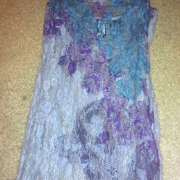 this tank top is lace and completely see- through. cami style with adjustable strap length. it is light grey with purple and teal flower lace design. says medium but i would consider it a small.