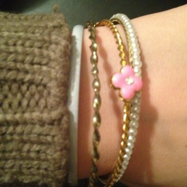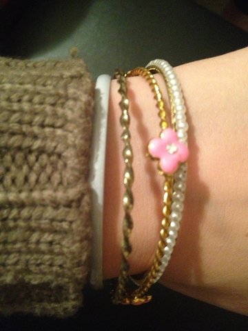 This photo shows a set of miscellaneous bangles, including a pearl, flower, twisted and plain white bangle. Purchased for around $2 each, the value is about $8. All in excellent condition.