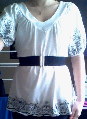 it is a white top with black flower stitching around it. belt does not come with it, but it does have loops for a belt. puffy sleeves. I have worn this several times and there is a good amount of piling on it, but it is still a "good" shirt in my opinion. I would say fits a s/m/l depending on how you like it to fit. tag says small though.